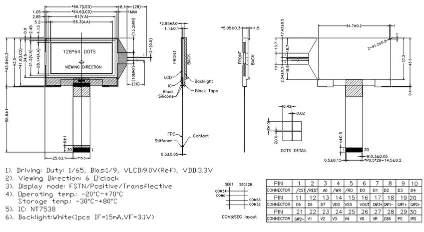 Art LCD Graphic LCD 128x64-C COG LED B/L-K/W 3.3V