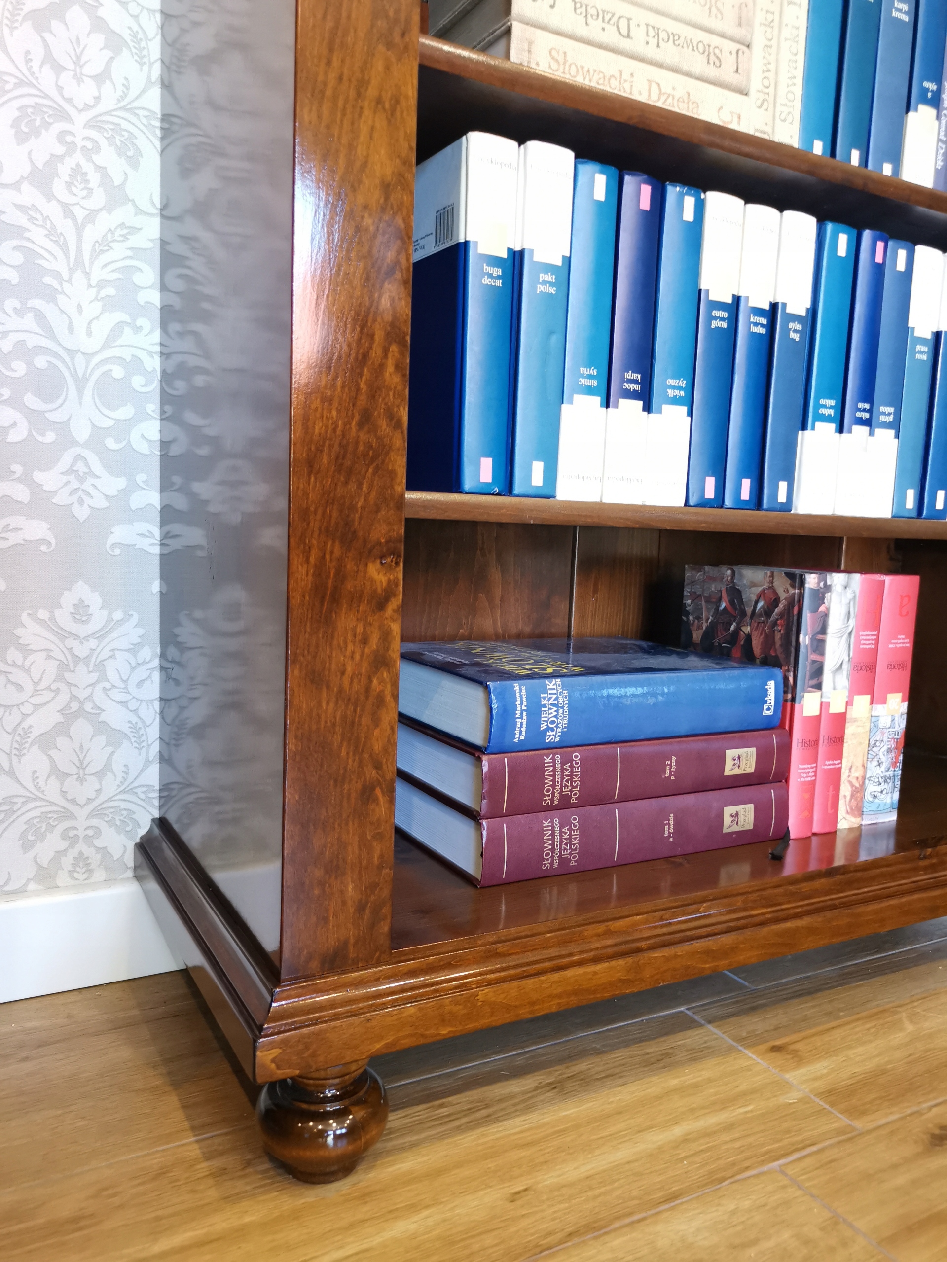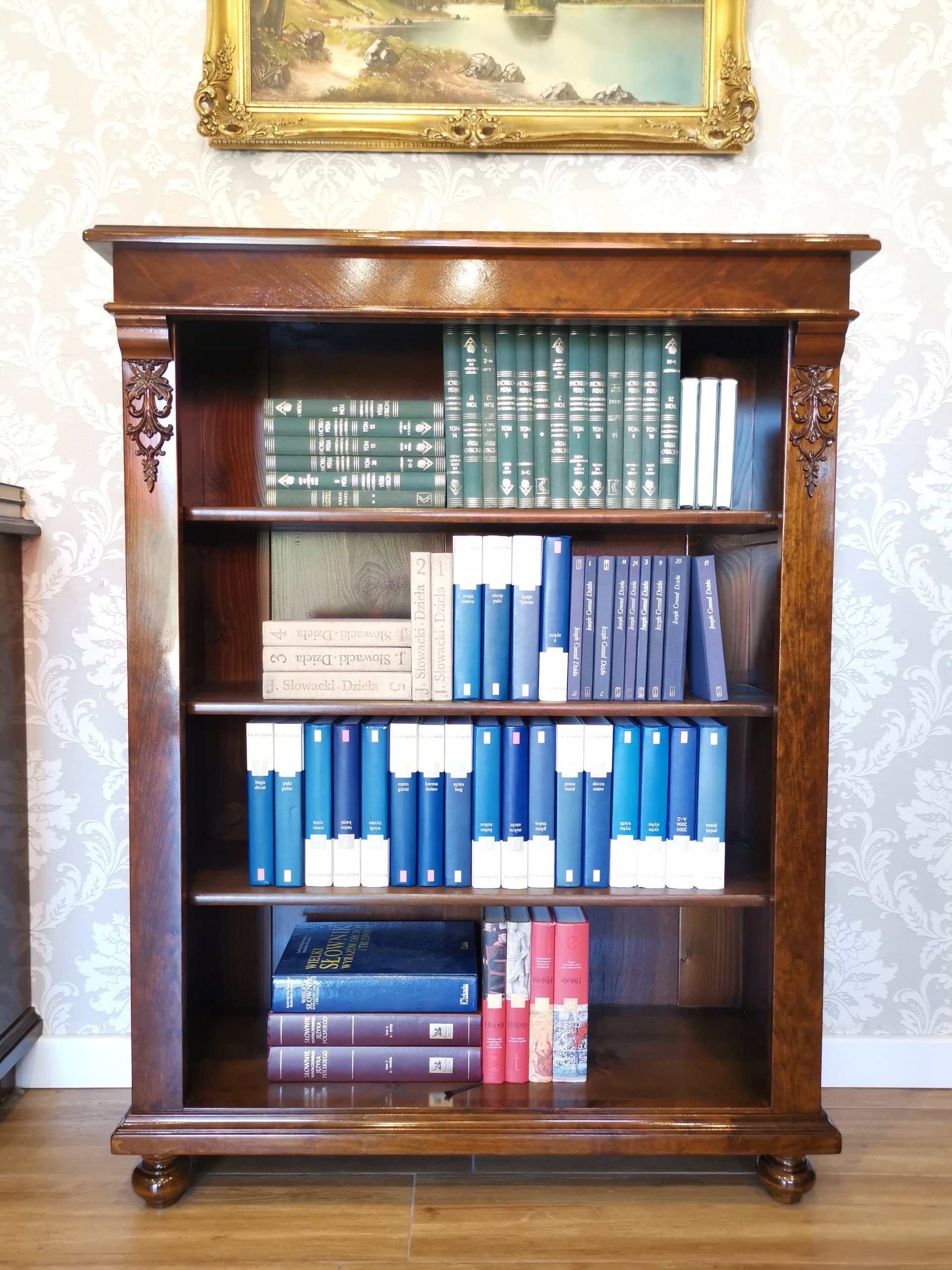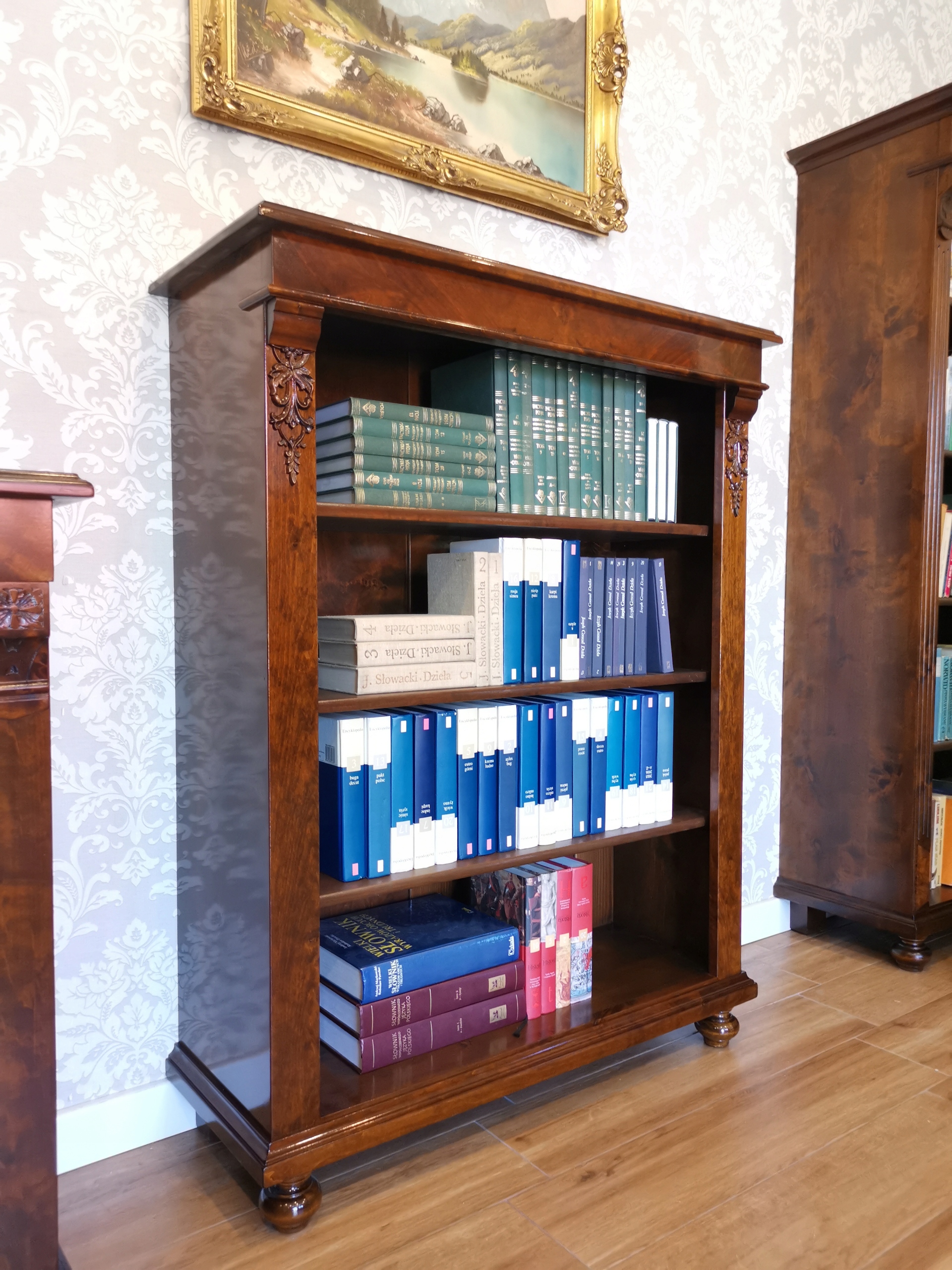 4 Ця книжкова шафа «Арт модерну» - це не лише предмет меблів - це витончена форма, яка приваблює зовнішній вигляд. Три просторі полиці без дверей вишукано відображають вміст, а шпонований шпона, забарвлений у глибокий відтінок волоського горіха, дає всю тепло і клас.