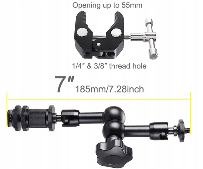 Дозволяє прикріпити різні типи фото-відео аксесуарів, наприклад, лампи, мікрофони, монітори, рекордери тощо до фотоапарата, обладнання чи роликових ковзанів для камери. Завдяки прикріпленому затиску краба тримач для труб або поперечин з максимальним діаметром 5 см.