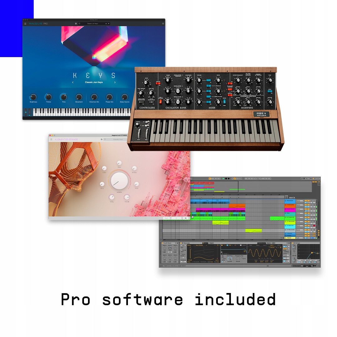 - Професійний пакет програмного забезпечення – Analog Lab Pro, Mini V, Piano V, Augmented Strings, Ableton Live Lite, NI The Gentleman та багато іншого.