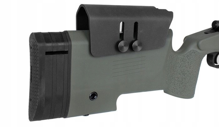 Приклад має гумовий затильник із регульованими прокладками та композитну, вкриту гумою та висувну щоку, закріплену двома великими гвинтами. Рукоятка, ручка та важіль заряджання мають протиковзку структуру.