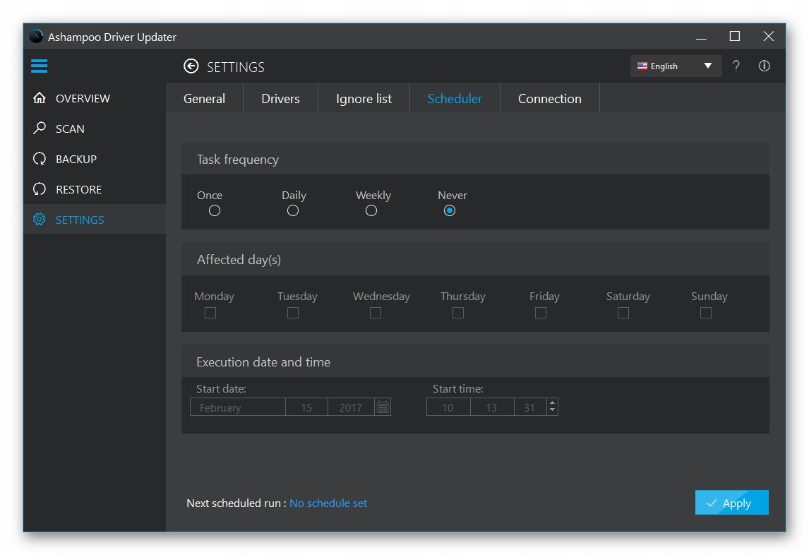 Ви вирішуєте, коли програма оновлення драйверів Ashampoo почне працювати. Вбудований планувальник дозволяє повністю контролювати політику сканування й оновлення системи. Після налаштування вам не доведеться витрачати час на перевірку актуальності системи, оскільки вона завжди буде актуальною!