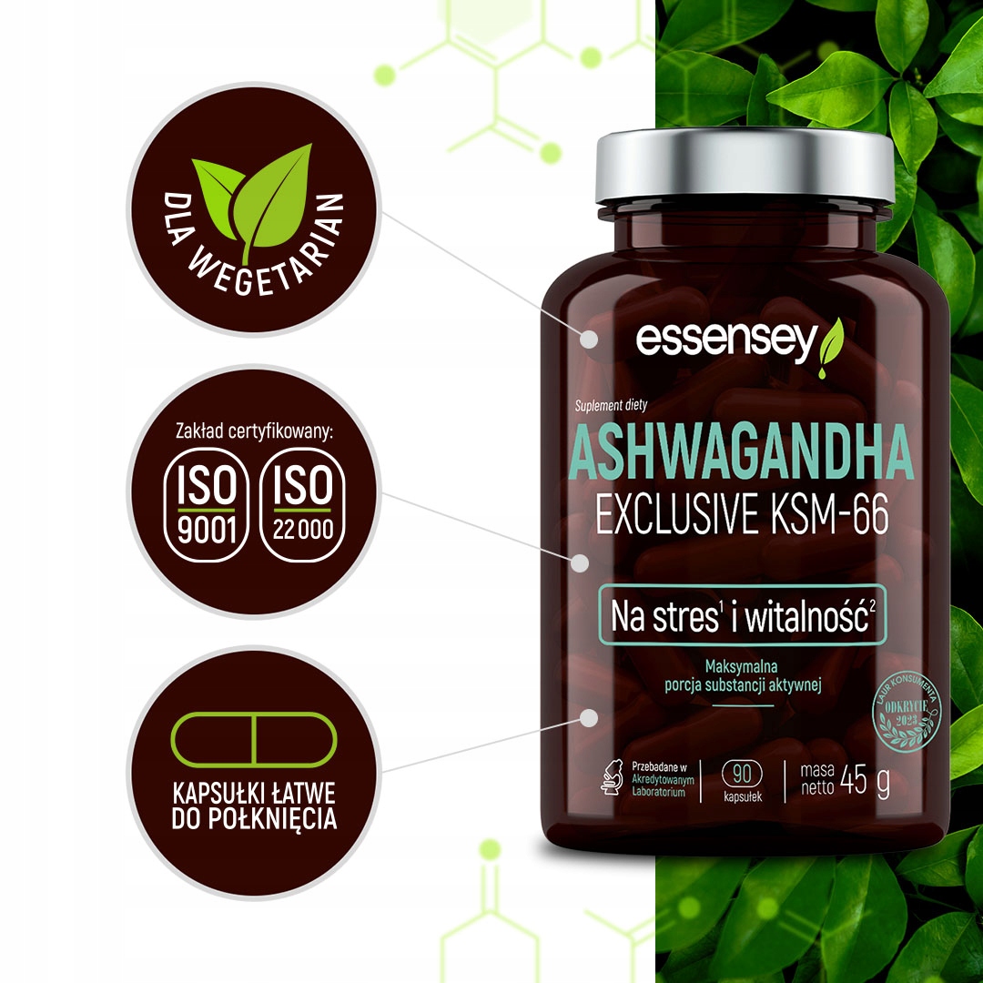 Дієтична добавка ESSENSEY ASHWAGANDHA EXCLUSIVE KSM-66 містить екстракт кореня ашваганди, який підтримує стійкість організму до стресів і допомагає підтримувати оптимальну витривалість, відчуття енергії та бадьорості. [1]