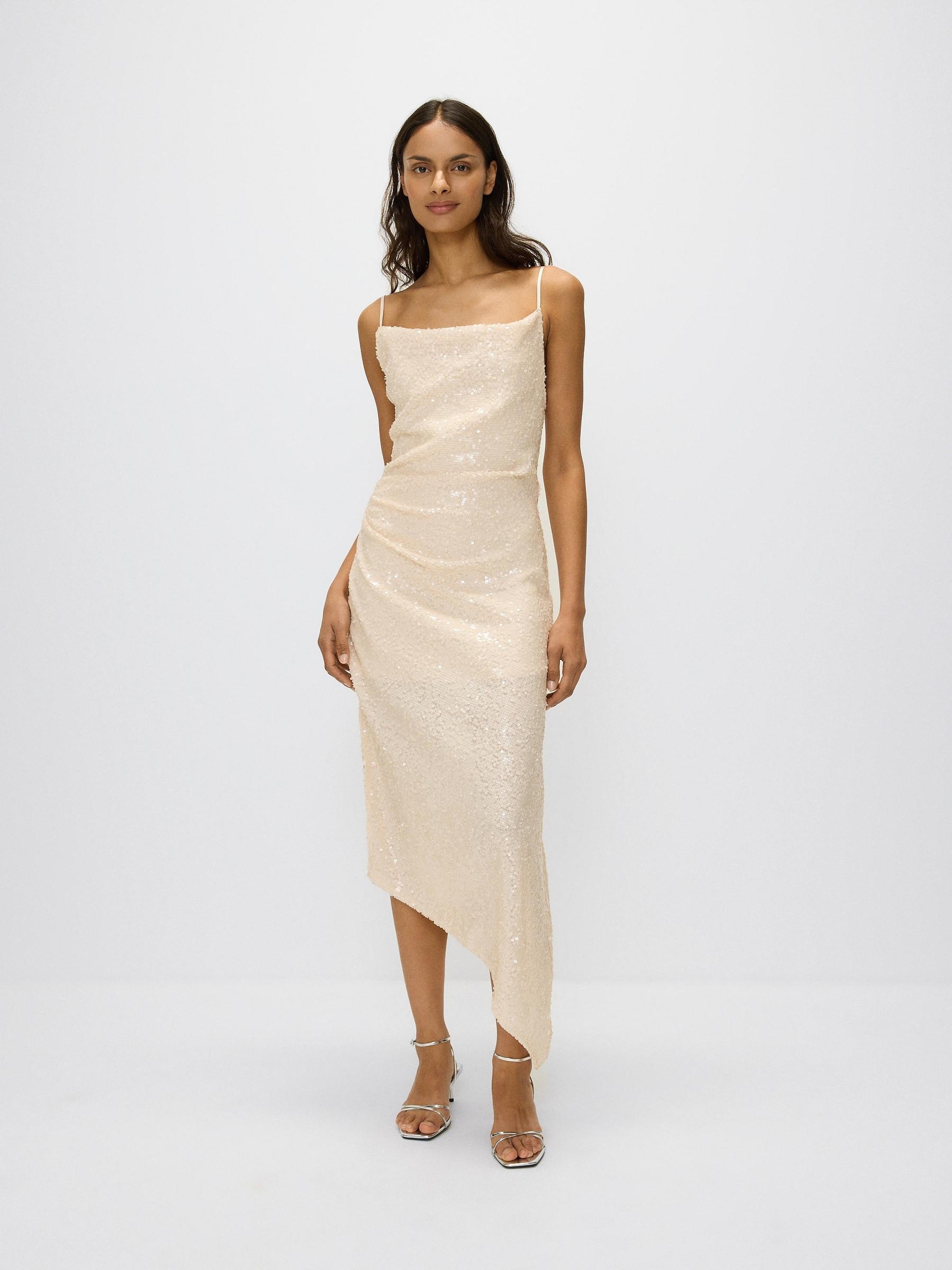 АСИМЕТРИЧНА СУКНЯ З БІЗЛЕТАМИ, БЕЖЕВА, НА БРЕЛЬЯХ, M
