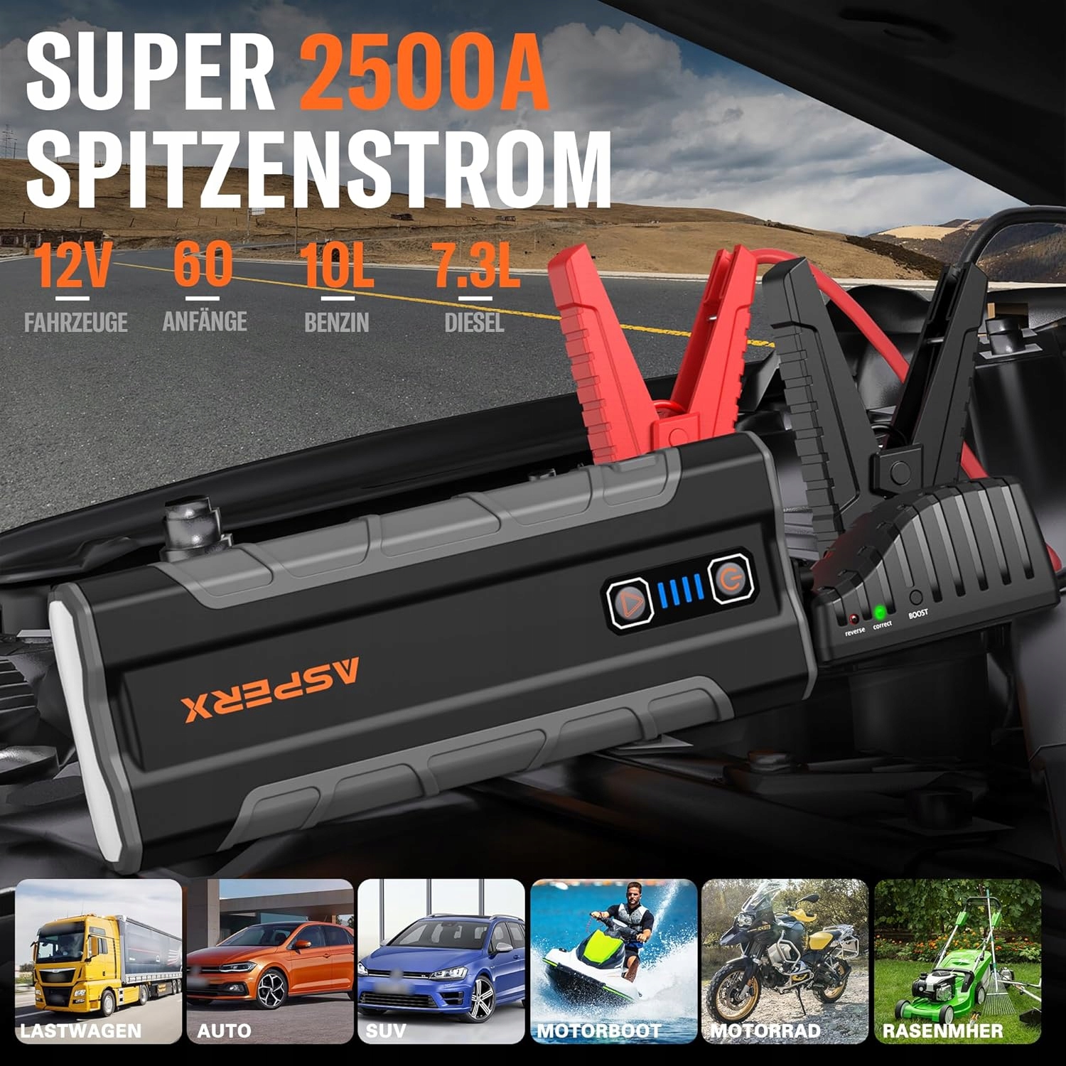 - 【2500A 12V Jump Starters】З піковим струмом 2500 A та ємністю 21000 мАг, акумуляторна батарея достатньо потужна, щоб запустити транспортні засоби на 12 V з бензиновими двигунами до 10 літрів / 7,3 літрів. Засіб допомоги при запуску AsperX підходить для автомобілів, вантажівок, позашляховиків, тракторів, газонокосарок, фургонів, мотоциклів, човнів, снігоходів, газонокосарок, караванів або тракторів тощо.