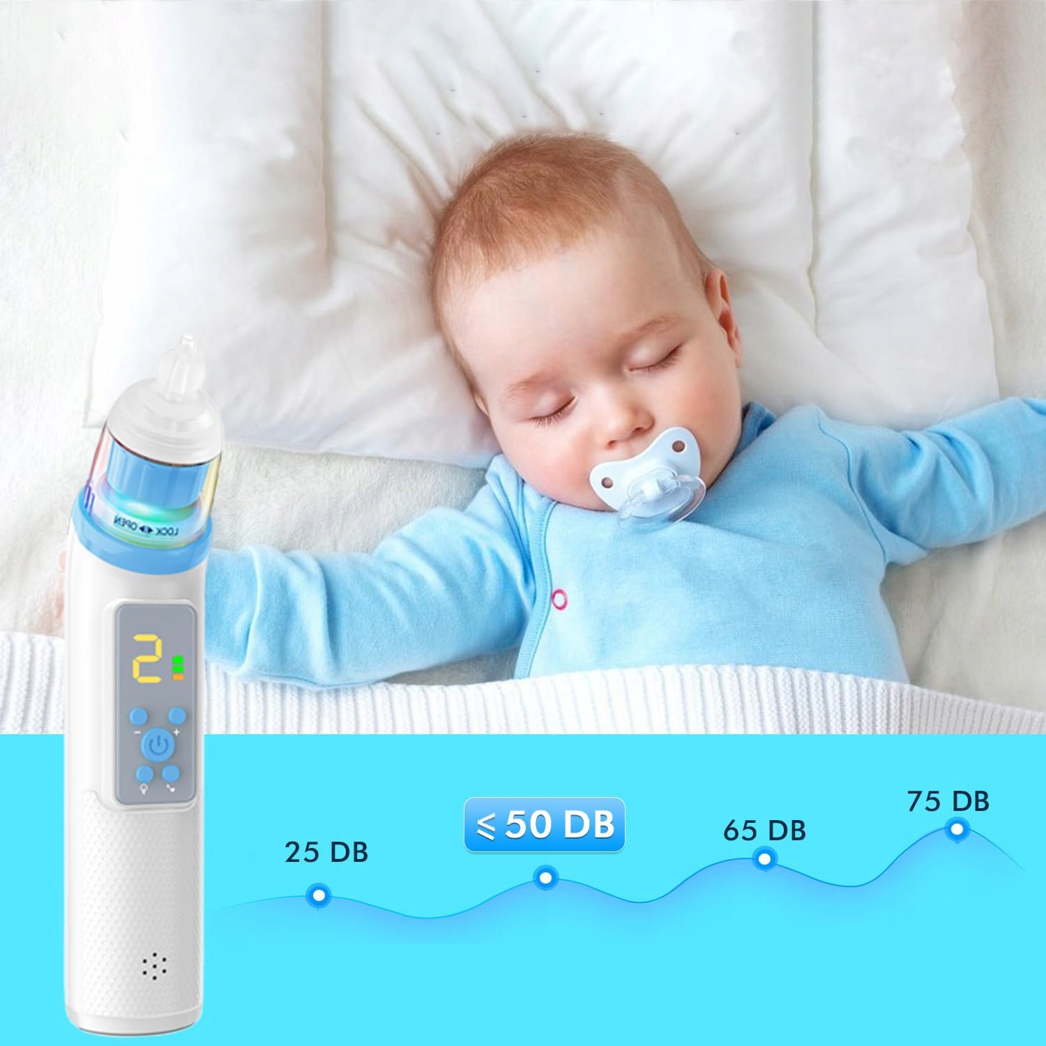 - Дитячий назальний аспіратор має вбудовані кольорові підсвічування, які можна використовувати з функцією заспокійливої музики, щоб привернути увагу дитини та ефективно зменшити його опір.