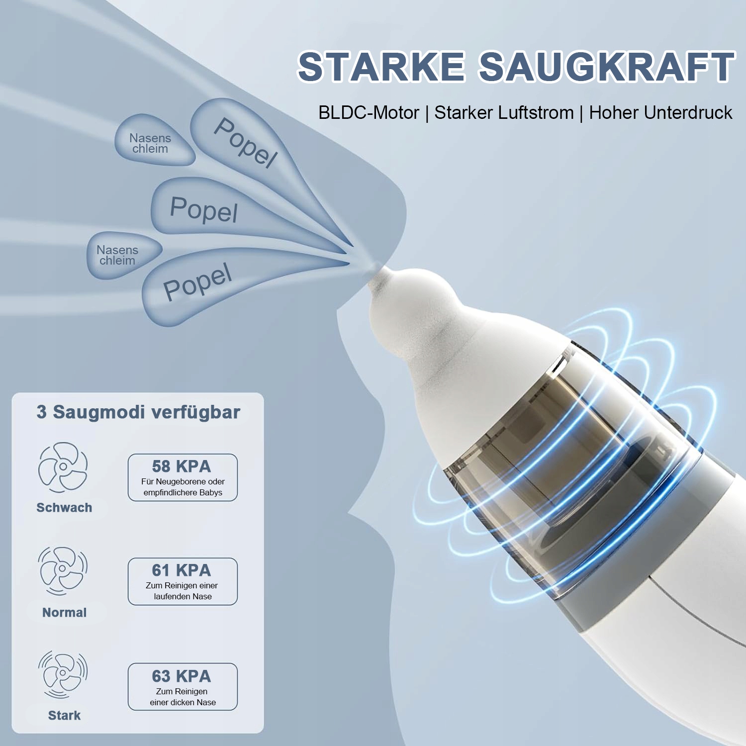 - Приводиться в дію високоефективним двигуном BLDC: створює сильний повітряний потік і негативний тиск для боротьби з липкими виділеннями з носа (Порада: спочатку розм’якшіть сухий слиз солоною водою!).