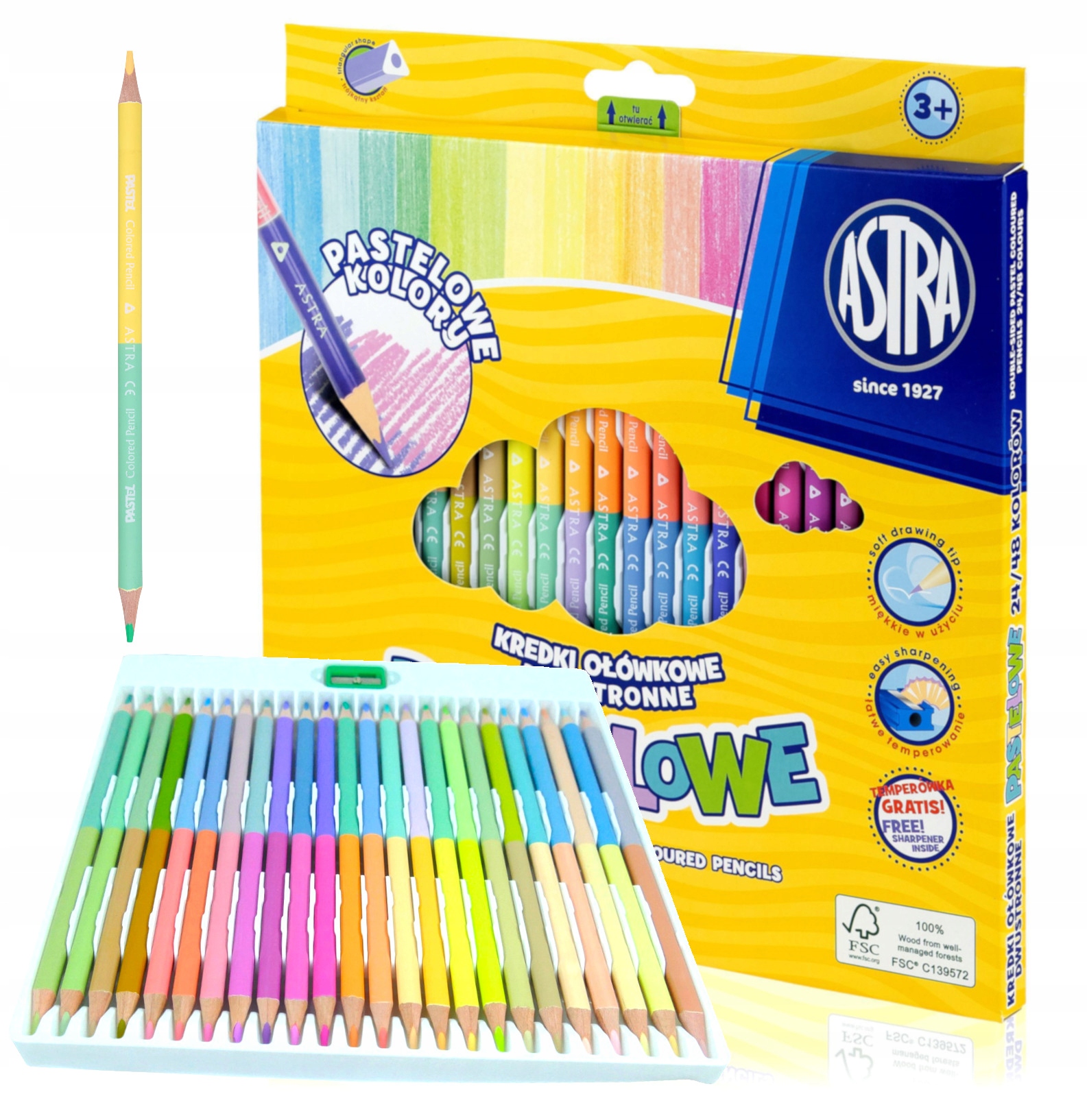 Крейди двосторонні олівці пастельних кольорів, трикутної форми. Крейди ASTRA відрізняються відмінною якістю. В упаковці 24 олівці (48 кольорів). До кольорових олівців додається точилка. Олівці відмінної якості. Олівці м'які у використанні, не пилять і не розмазуються. Вони легко заточуються. Надзвичайно інтенсивні та насичені кольори. Вони мають виразні кольори та привабливий дизайн. Широка палітра кольорів. Вони чудово покривають і ідеально підходять для малювання. Олівці ідеально лягають в ручку дитини. Вони мають шестикутну форму.