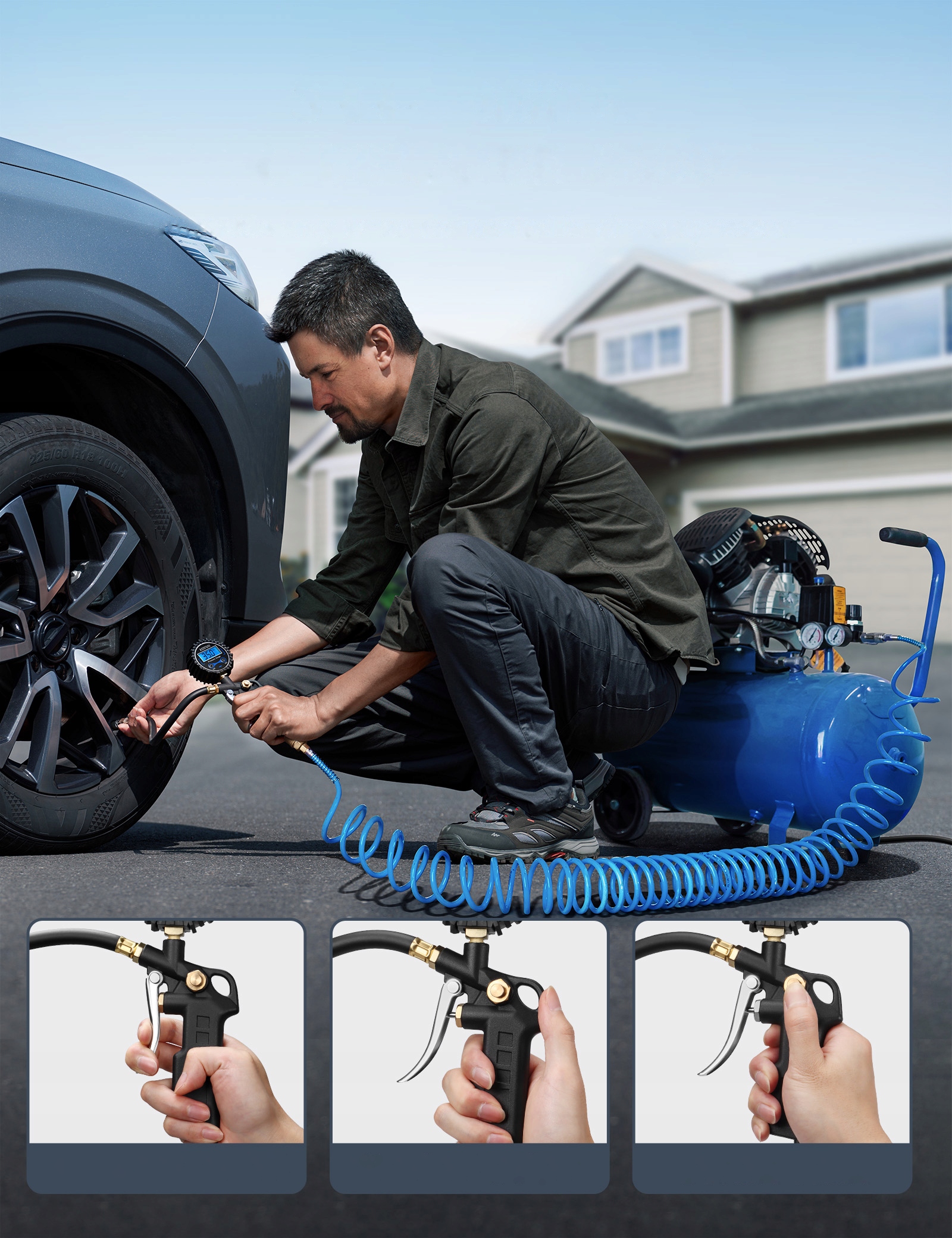 ✔ Домашнє використання: Перевірка та регулювання тиску в пасажирських автомобілях, мотоциклах та велосипедах; Підтримка належного тиску в колясних шинах та спортивному обладнанні.