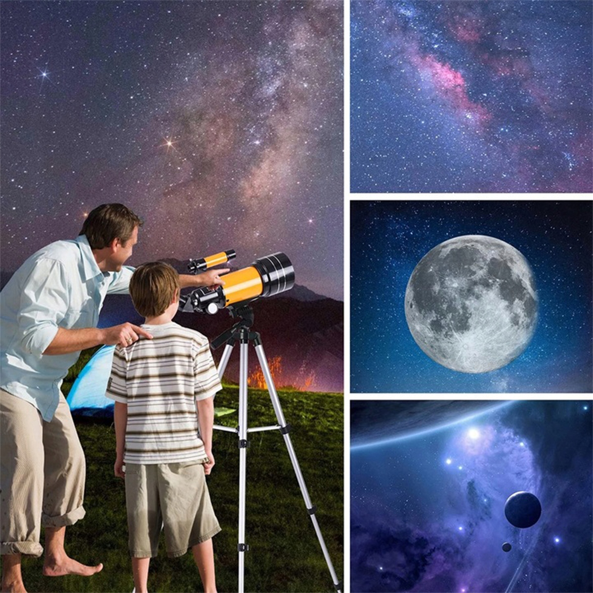 Наш астрономічний телескоп — це герметичний монокулярний телескоп-рефрактор, який запобігає конвекції повітря та забезпечує чіткі та стабільні зображення. Оснащений об’єктивом з великою апертурою 70 мм і фокусною відстанню 300 мм, наш астрономічний телескоп-рефрактор забезпечує чіткіші та яскравіші зображення порівняно з іншими телескопами з малою апертурою.