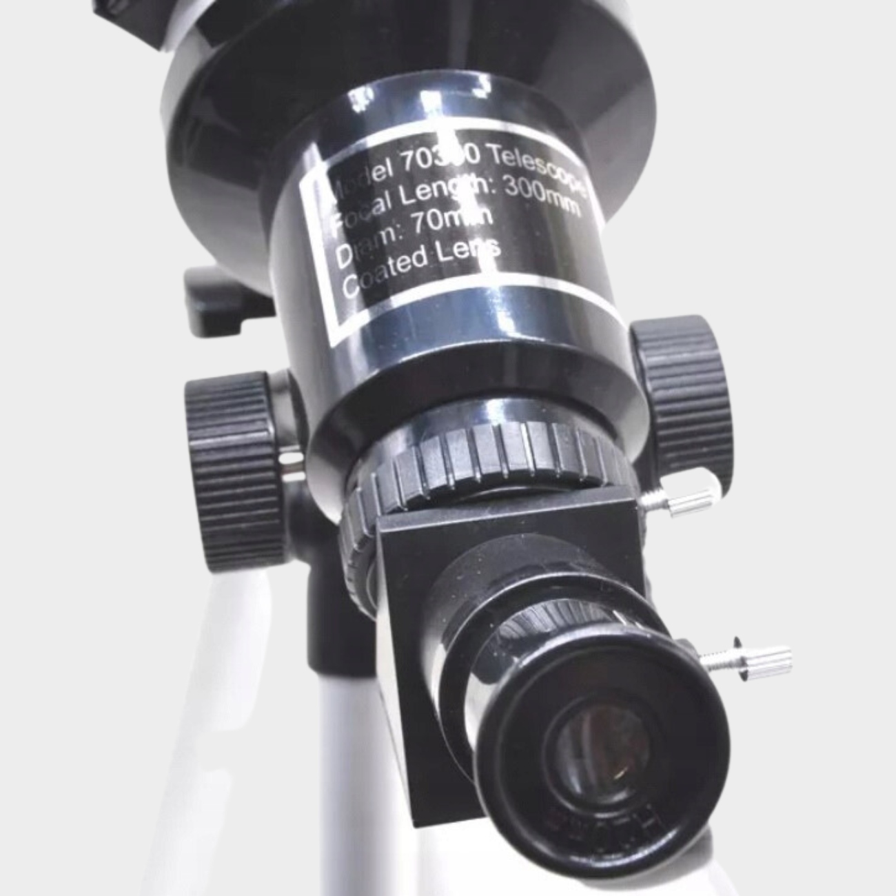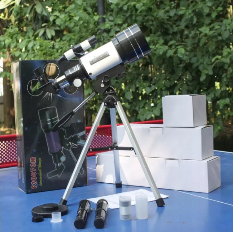 - У набір входить телескоп з діаметром лінзи 70 мм і фокусною відстанню 300 мм