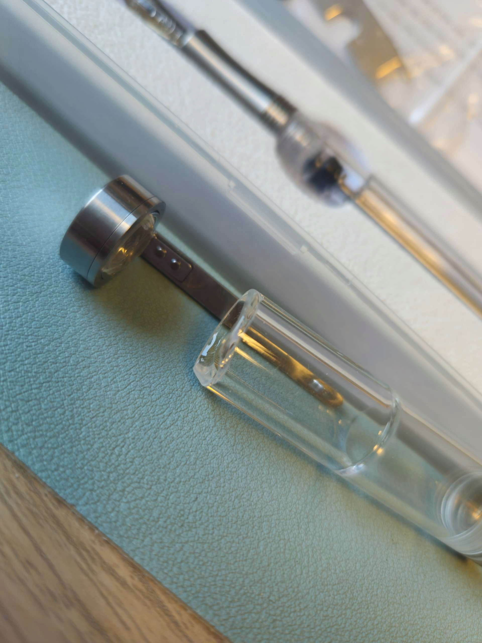 - Легка заповнення-просто відкрутить наконечник, витягніть вакуумну шпильку, а потім натисніть вниз вниз вниз. Щоб довше використовувати ручку, відкрийте вакуумну ручку декілька поворотів, щоб чорнило дозволило текти з бочки в NIB.