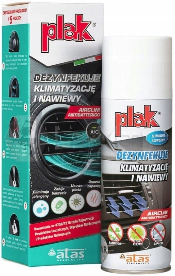 Plak Airclim Antibatterico — препарат, призначений для бактерицидної та фунгіцидної дезінфекції систем кондиціонування, вентиляційних отворів і повітря в автомобілях. Продукт надзвичайно простий у використанні та дозволяє самостійно продезінфікувати систему кондиціонування за лічені хвилини. Володіє антибактеріальними властивостями та усуває неприємні запахи цвілі, тютюнового диму та тваринного походження. Залишає свіжий аромат.