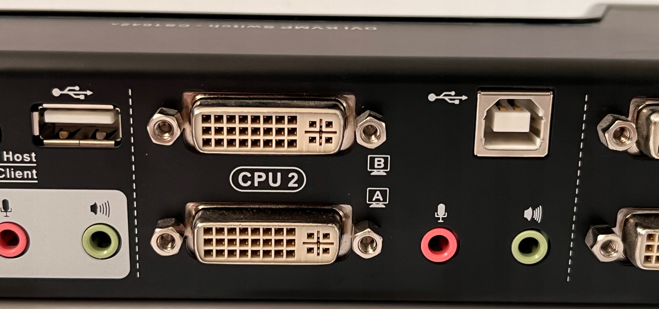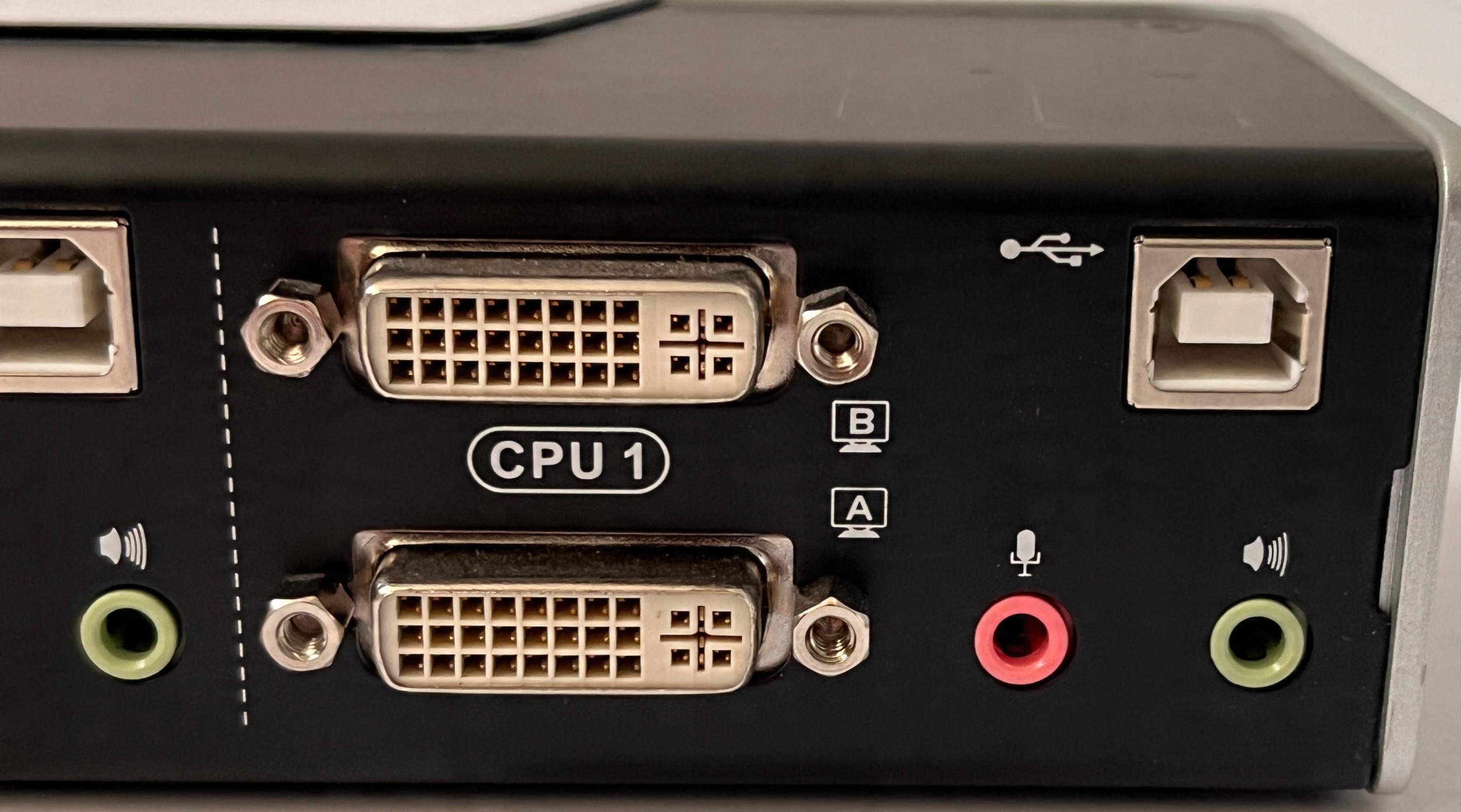 - Одна USB-консоль із подвійним екраном керує двома комп’ютерами з двома екранами та двома іншими пристроями USB