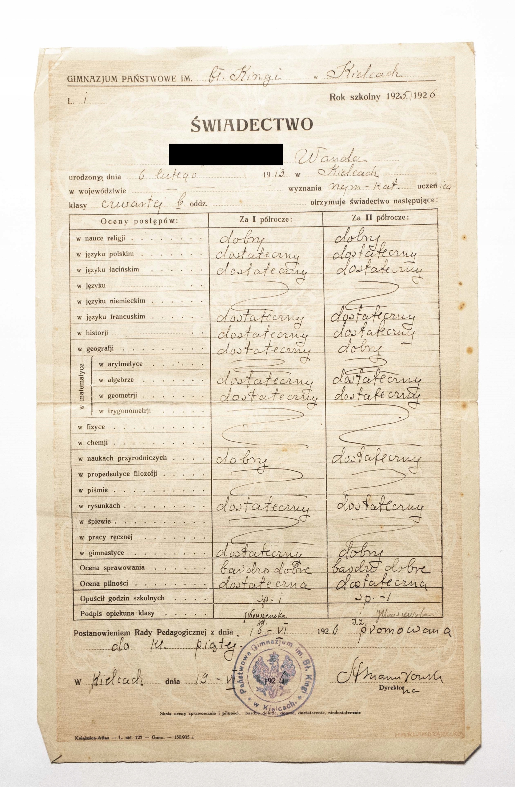 АТЕСТАТ - ДЕРЖАВНА ГІМНАЗІЯ, КЕЛЬЦЕ 1926