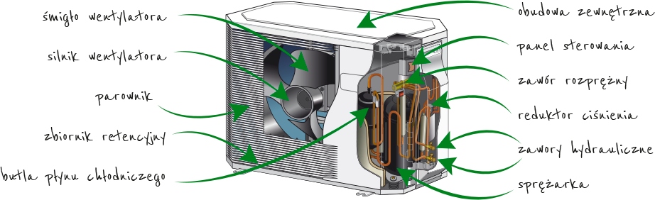 Цей модуль встановлений поза будівлею. Він складається з вентилятора, компресора, випарника та розширення клапана.