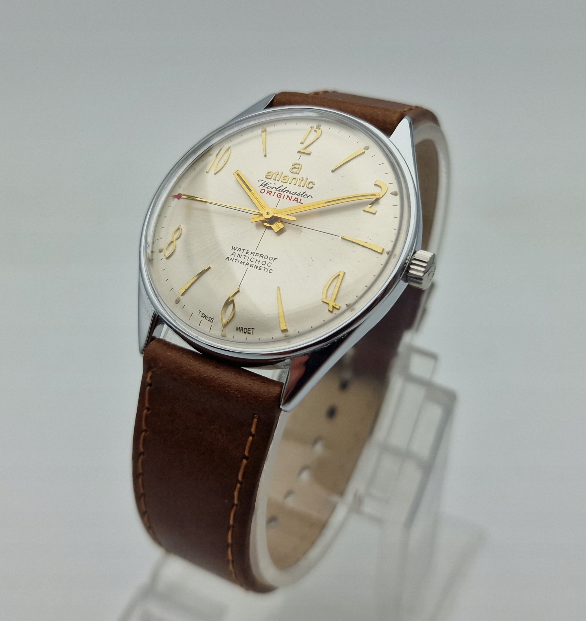 - Срібний металевий циферблат із золотими годинниковими мітками. Оригінальний циферблат із підписом: «ATLANTIC WORLDMASTER , ORIGINAL, ANTIMAGNETIC, ANTICHOC, WATERPROOF, SWISS MADE». Циферблат в ідеальному стані, не реставрований.