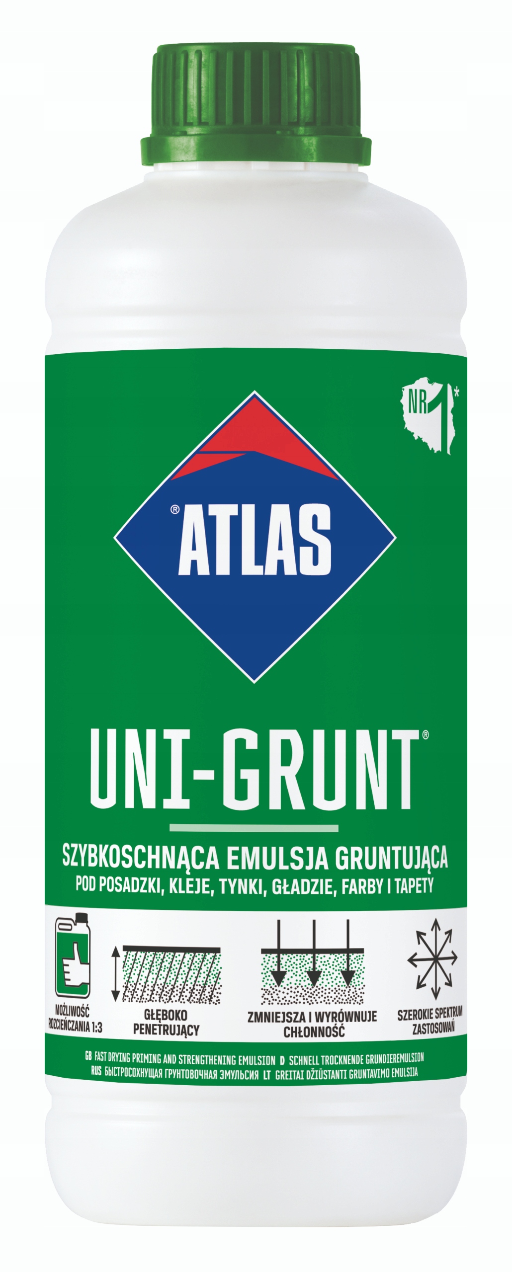 ATLAS UNI-GRUNT - ґрунтувальна емульсія. Atlas рекомендується для ґрунтування вбираючих, надмірно вбираючих та ослаблених основ, таких як: бетон, гіпсокартон, гіпс, цемент та неоштукатурені штукатурки. стіни з усіх видів цегли, блоків, пустотілої цегли, бетонних та ангідритових стяжок; підкладки на основі деревини. Покращує зв'язування будівельних розчинів - сприяє досягненню заданих технічних параметрів.
