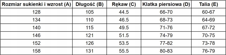 На цьому аукціоні ми продаємо сукню 128 розміру. Перед покупкою виміряйте розміри дитини та порівняйте розміри зі значеннями в таблиці нижче. Завдяки цьому ви будете впевнені, що замовлений розмір підійде.