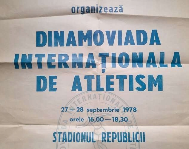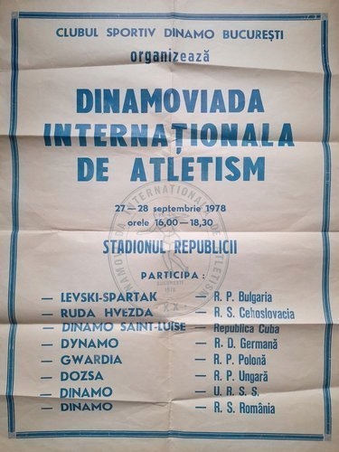 Умова: Добре Опис: оригінальний, великий плакат, що оголошує міжнародний змагання з легкої атлетики - Дінамовіада - на Республіканському стадіоні в Бухаресті (Румунія). Ведучим змаганням був клуб Dinamo Bucharest, а на заході також взяли участь, серед інших атлетичних гуртів Левський-Спартак Софія (Болгарія), Дінамо Сент-Лау (Куба), Гвардія Варшава (Польща) та Динамо Берлін (GDR).