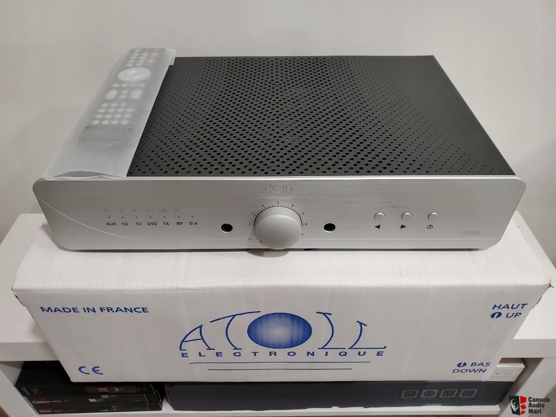 Atoll IN80 Signature у сріблястому кольорі - новий інтегрований підсилювач потужністю 2 x 80 Вт/ 8 Ом, 2 x 120 Вт/ 4 Ом, входить до складу пульта дистанційного керування, виготовлено у Франції.