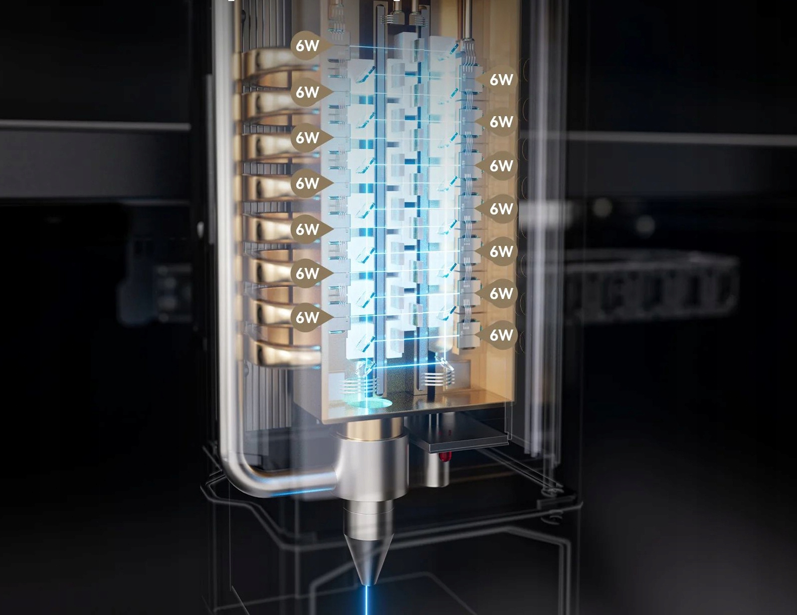 Це 14 діодів і довгий лазерний промінь (сфокусований) дозволяють різати матеріали товщиною до понад 20 мм