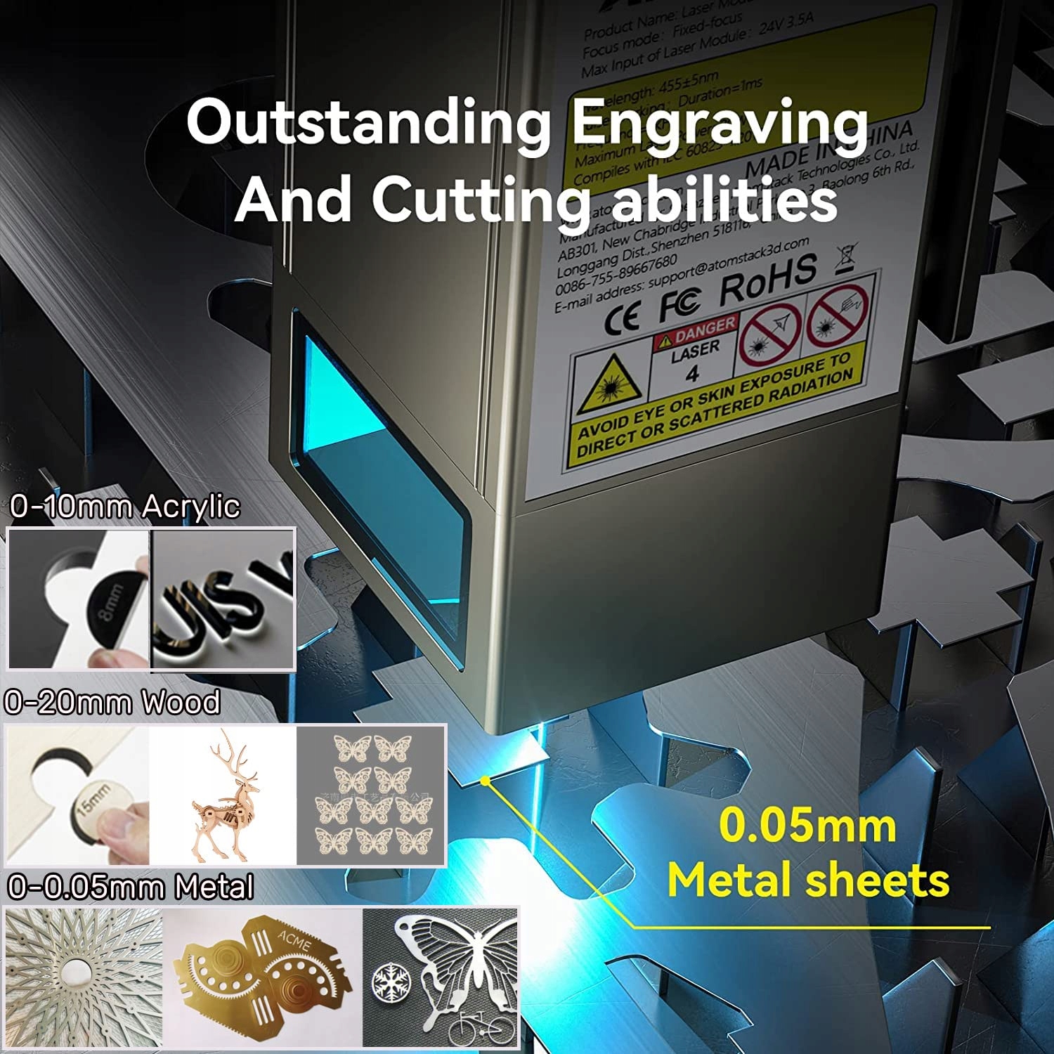 ✨ПОТУЖНЕ ГРАВІЮВАННЯ: ATOMSTACK S20 PRO — це перша машина для напівпровідникового лазерного гравірування потужністю 130 Вт. У ній використано технологію чотириканального лазерного з’єднання останнього покоління потужністю 6 Вт, а вихідна потужність збільшується до 20 Вт. одночасно різати дошку павловнії товщиною 15 мм, чорну акрилову дошку товщиною 8 мм і легко різати понад 40 видів матеріалів, наприклад дошку з нержавіючої сталі товщиною 0,05 мм.