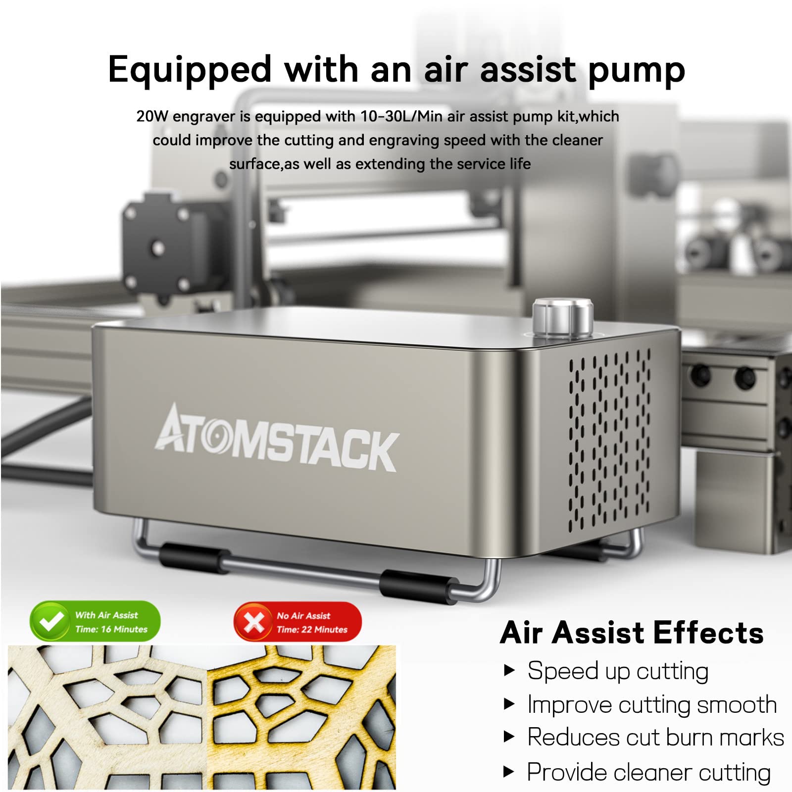 ✨ ЧИСТІШЕ ГРАВІЮВАННЯ: Лазерний гравер S20 PRO постачається з оновленим професійним комплектом подачі повітря F30, який включає два вбудовані насоси подачі повітря. Це робить його вдвічі ефективнішим за інші повітряні підсилювачі. Повітряний набір підтримує чистоту поверхонь і значно покращує якість гравіювання. Товста алюмінієва кришка робить його міцнішим і витривалішим, виділяє менше тепла та служить довше.