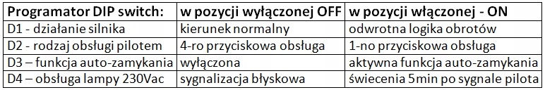 D4 – горить на 5 хв. рекомендовано для гаражних воріт -> світло протягом 5 хвилин. після активації пультом.