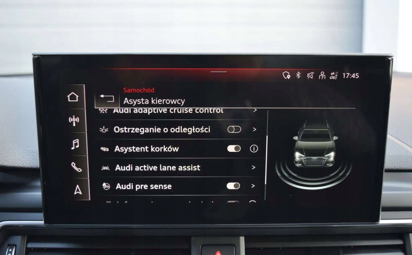 Пакет служби допомоги водія: Система підтримки водія: Система підтримки водія, що підтримує водій, що підтверджує. braking function in the city (Audi Pre Sense City), System, System, system Driver support: traffic jam assistant, driver assistance system: assistant to avoid obstacles, driver assistance system: left turn assistant, driver support system: adaptive cruise control with the STOP & go system including Audi Pre Sent Sense Front, driver support system: Assistant to keep the lane (active lane assistant)