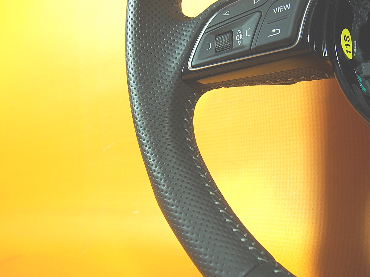 Спортивне, багатофункціональне, скошене кермо з логотипом «S», оброблене чорною перфорованою шкірою та яскравою ниткою