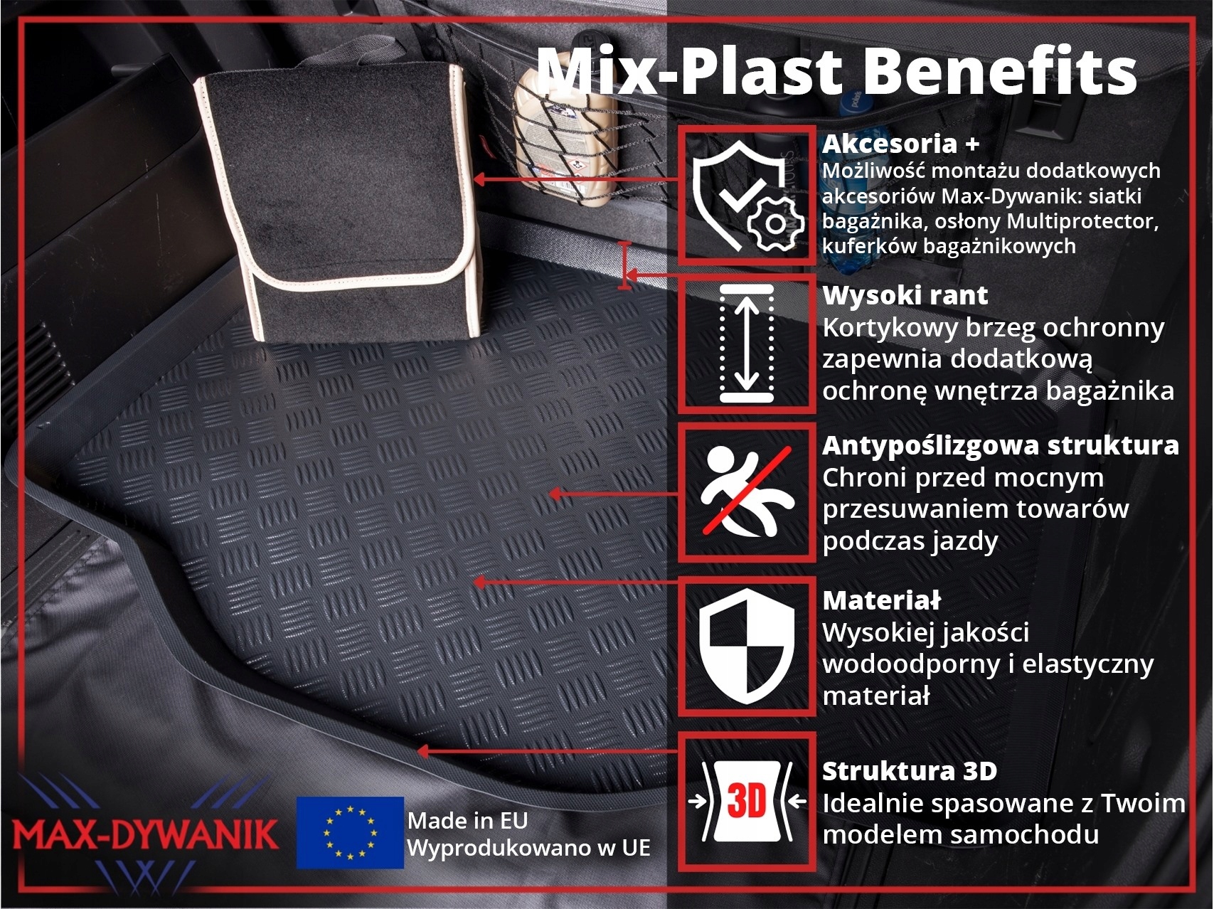 Пропонований вкладиш багажника (килимок) був точно розроблений відповідно до форми багажника, враховуючи не лише марку/модель чи версію кузова, але й тип обладнання, завдяки килимок ідеально поміщається в нішу багажного відділення. Килимок виготовлено з міцного та гнучкого пластику, стійкого до бензину, масел або жиру. Килимок легко чиститься і стійкий до низьких і високих температур. Високий захисний комір навколо килима ефективно утримує воду та бруд, захищаючи оригінальний килим багажника від бруду та затоплення. Гнучкий і легкий матеріал дозволяє легко класти килимок у машину та виносити з неї, наприклад, під час чищення, або згортати її для зберігання чи транспортування.