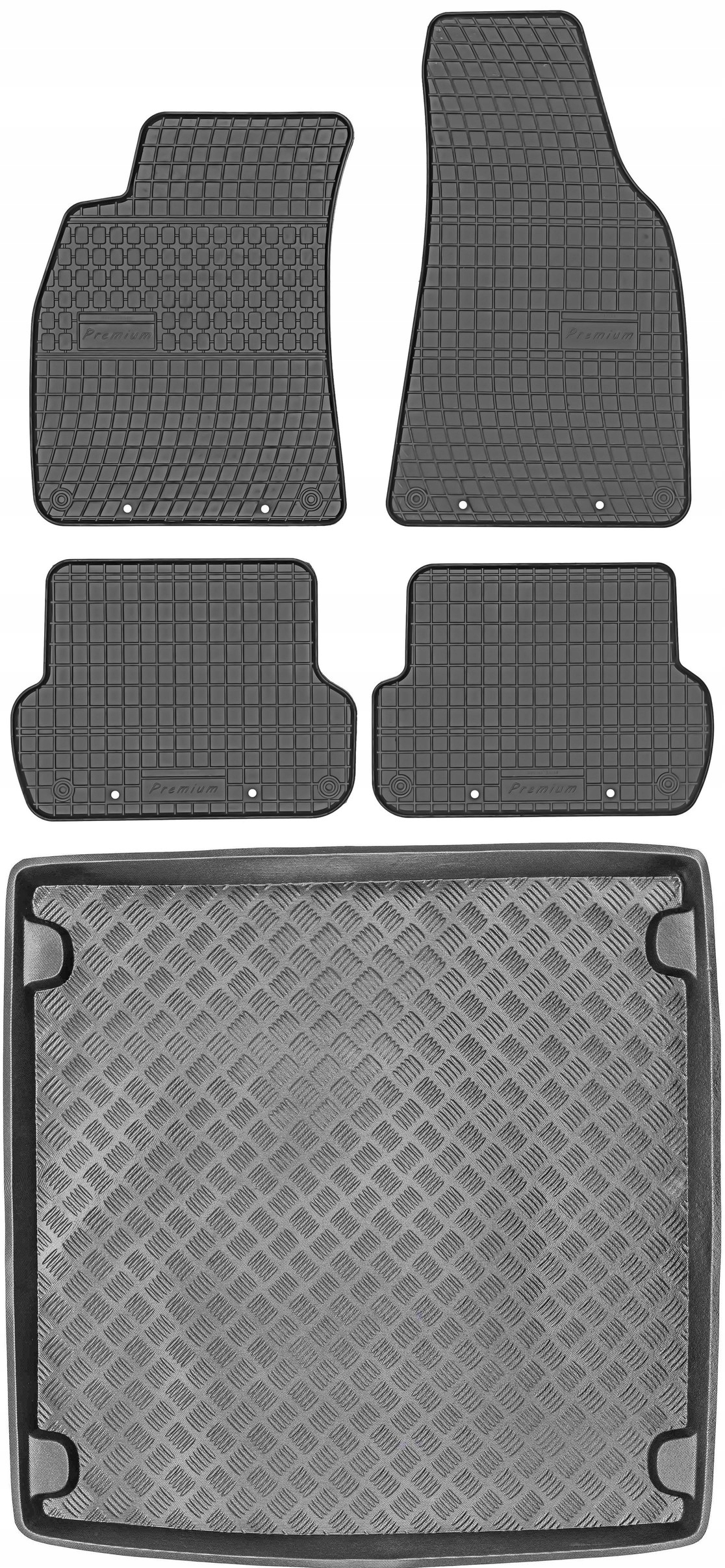 Набір, створений компанією MAX-DYWANIK®, складається з гумових килимків від польської компанії PRISMAT разом з пластиковим килимком в багажник від польської компанії MIX-PLAST.