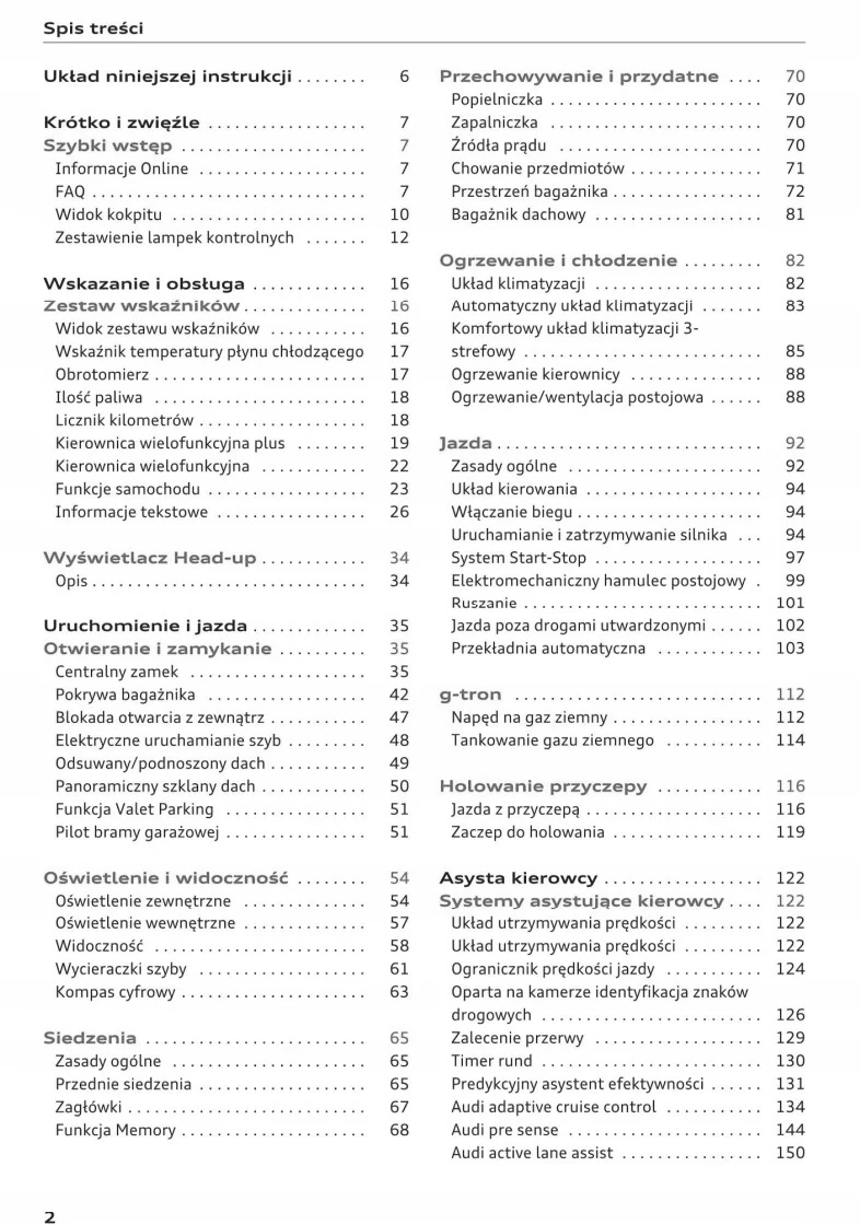 Посібник з експлуатації Audi містить усі версії обладнання та корисну інформацію щодо ефективного та безпечного використання автомобіля, наприклад, індикатори, контрольні лампи, відкривання та закривання, освітлення та видимість, сидіння, відділення для речей, опалення, вентиляція, кондиціонування повітря - водіння, поради з експлуатації, технічне обслуговування автомобіля - рівень рідини, перевірка та заправка, аварійні операції, заміна коліс, запобіжників, заміна лампочок - технічні дані... та багато іншого, що дає відчуття безпеки та комфорту мандрівникам. Польське законодавство зобов’язує продавця додавати інструкцію з експлуатації автомобіля польською мовою. Посібник з експлуатації автомобіля новий і польською мовою.