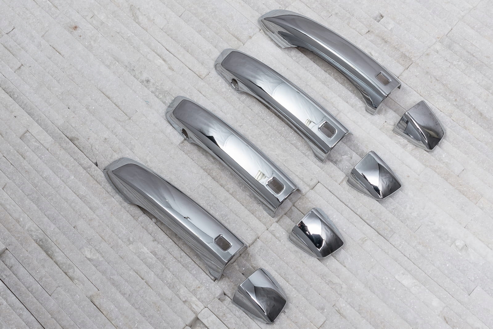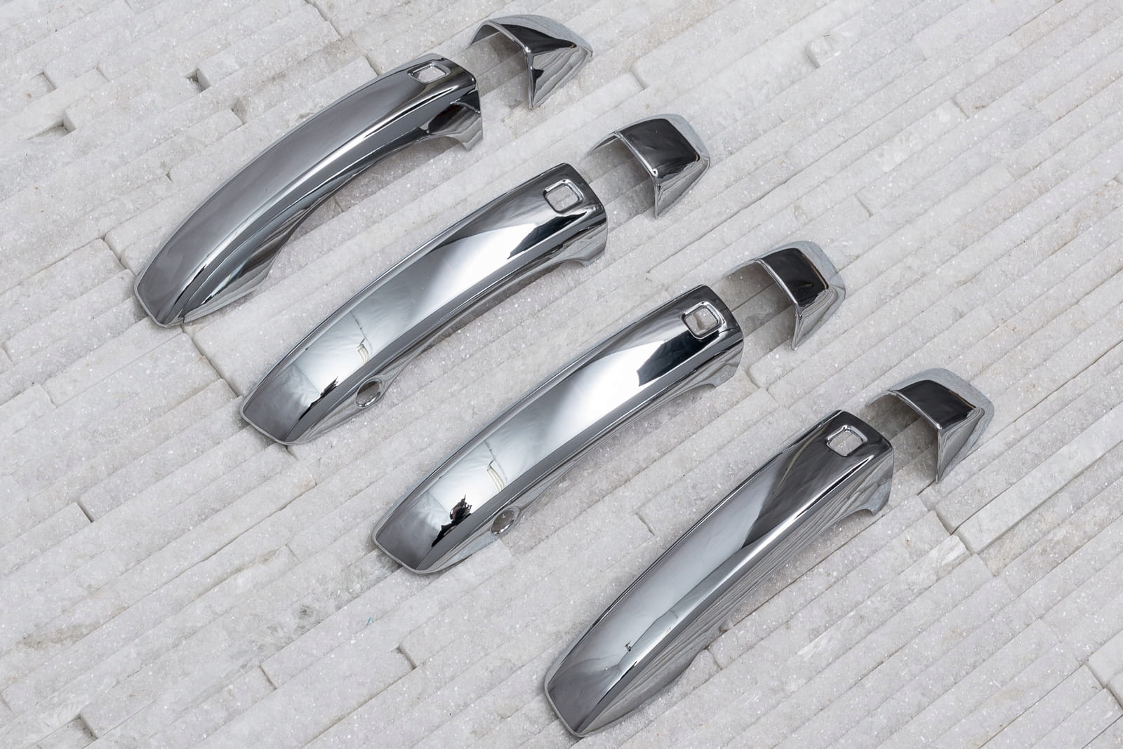 Декоративні хромовані накладки на дверні ручки є доповненням, яке доповнює стиль автомобіля ноткою спортивної елегантності. Ідеально підігнані до контурів автомобіля, вони змінюють образ дверних ручок моделі А6, роблячи їх справжньою окрасою автомобіля. Виріб виготовлено з високоякісного хромованого ABS пластику.