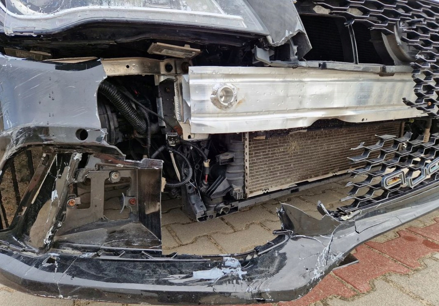 Audi має пошкоджений передній бампер і ламп, світлодіод і двигун, в якому ви можете почути