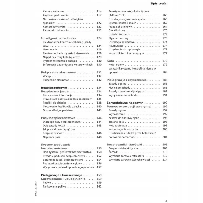 Посібник з експлуатації Audi містить усі версії обладнання та корисну інформацію щодо ефективного та безпечного використання автомобіля, наприклад, індикатори, контрольні лампи, відкривання та закривання, освітлення та видимість, сидіння, відділення для речей, опалення, вентиляція, кондиціонування повітря - водіння, поради з експлуатації, технічне обслуговування автомобіля - рівень рідини, перевірка та доливка, дії в надзвичайних ситуаціях, заміна коліс, запобіжників, заміна лампочок - технічні дані... та багато іншого, що дає відчуття безпеки та комфорту мандрівникам Польське законодавство зобов'язує продавця надати інструкцію з експлуатації автомобіля польською мовою. Посібник з експлуатації автомобіля новий і польською мовою.