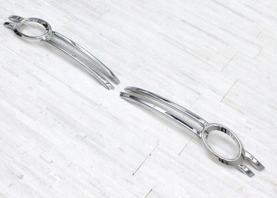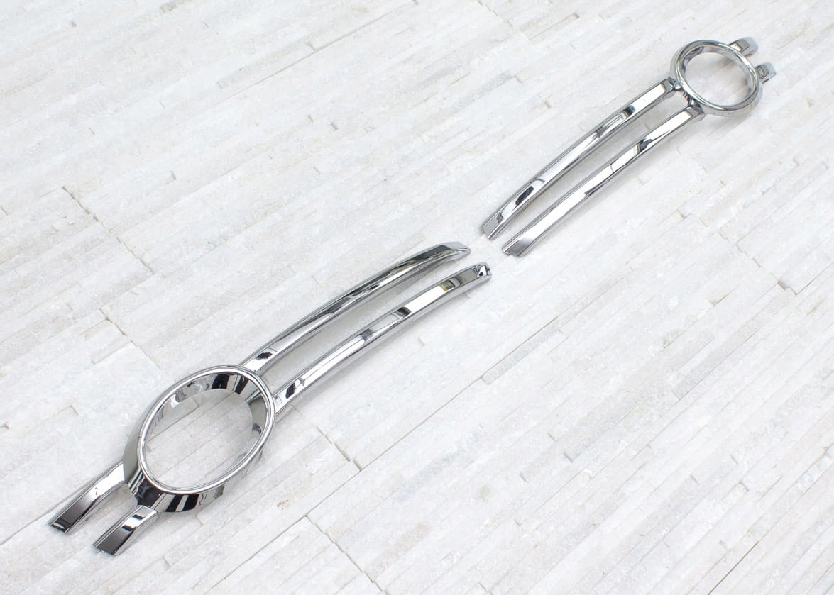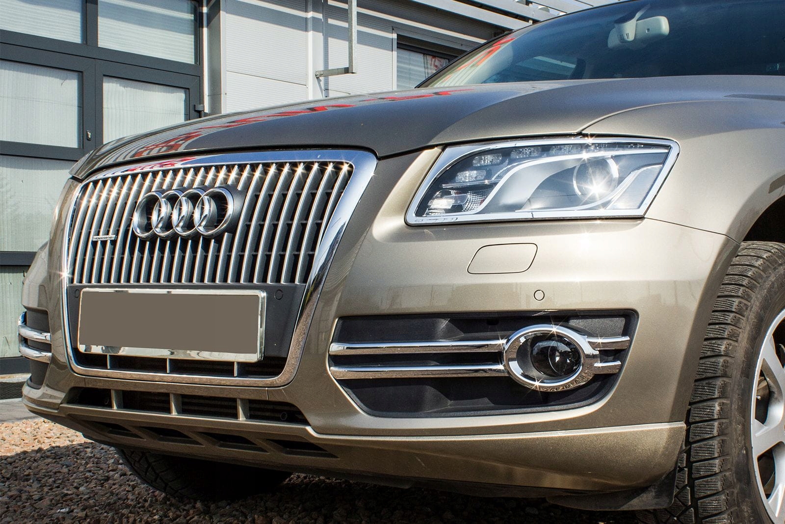 Стилістичні накладки створюють гарне обрамлення для галогенних фар, роблячи їх справжньою окрасою передньої частини автомобіля. Декоративні смуги додатково доповнюють простір з боків світильників елегантним і спортивним акцентом. Завдяки глянсовій хромованій поверхні накладки ідеально відповідають стильному, розкішному стилю AUDI Q5. Виріб виготовлено з високоякісного хромованого ABS пластику.