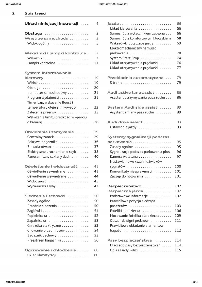 Посібник з експлуатації Audi містить усі версії обладнання та корисну інформацію про те, як ефективно та безпечно використовувати автомобіль, напр. - індикатори, контрольні лампи, відкриття та закриття - освітлення та видимість, сидіння, відділення для речей, опалення, вентиляція, кондиціонування - водіння, поради з експлуатації, технічне обслуговування автомобіля - рівень рідини, перевірка та доливання, аварійні операції, заміна коліс, запобіжників, заміна лампочок - технічні дані... та багато іншого, що дає відчуття безпеки та комфорту мандрівникам. Польське законодавство зобов’язує продавця додавати інструкцію до автомобіля польською мовою. Посібник з експлуатації автомобіля новий і польською мовою.