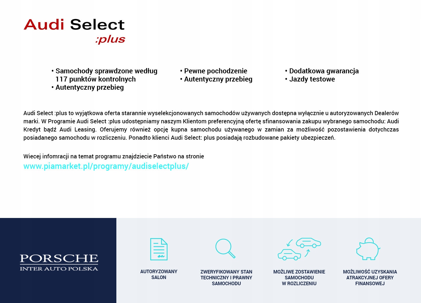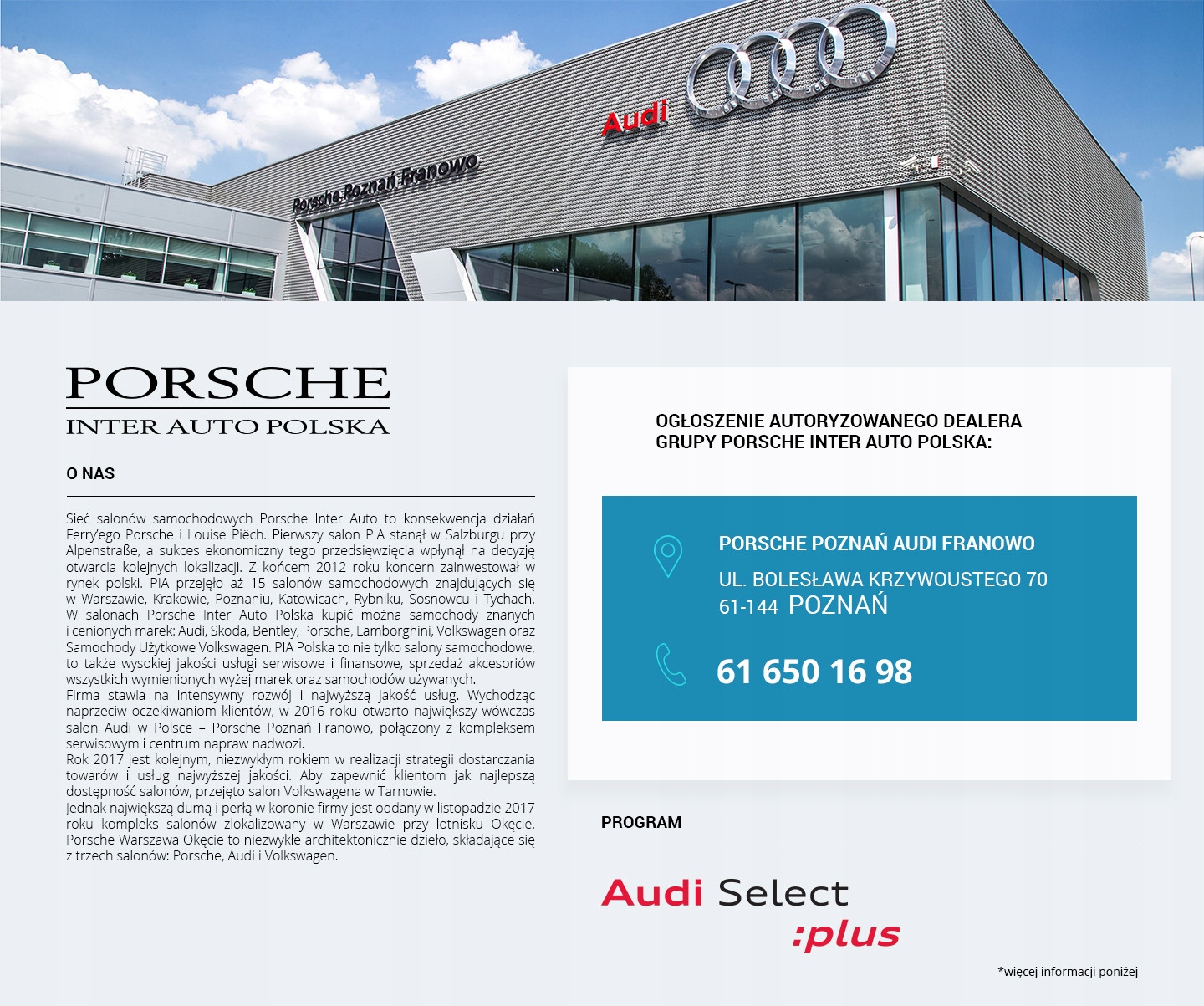 PORSCHE INTER AUTO POLSKA (Audi Porsche Poznań Franowo), офіційний дилер бренду Audi, представляє пропозицію вживаних автомобілів. Наша компанія, будучи частиною міжнародної мережі Porsche Inter Auto, спеціалізується на продажу нових та вживаних автомобілів. Ми пропонуємо лише автомобілі, які відповідають найвищим стандартам якості, забезпечуючи нашим клієнтам комфорт і безпеку на дорозі.
