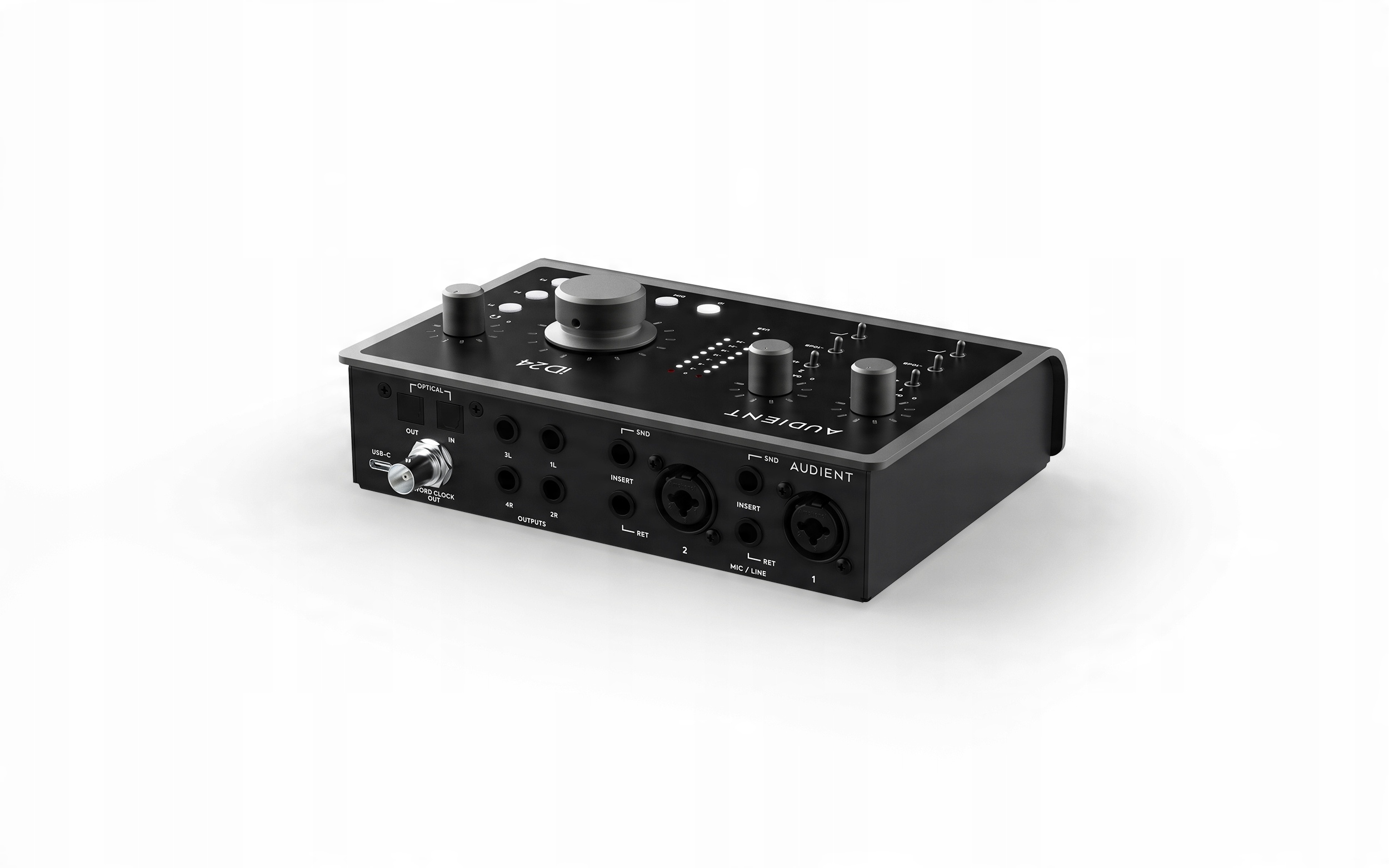 Audient iD24 – це найновіший аудіоінтерфейс від британського бренду Audient, випущений у лютому 2023 року. Audient iD24 включає два мікрофонних попередніх підсилювача Audient Console ASP8024-HE, а перетворювачі використовують 32-розрядну технологію ЦАП із динамічним діапазоном 126 дБ. Крім того, тепер користувачі можуть записувати більші сеанси через оптичні входи та виходи; ADAT і SPDiF дозволяють додати до восьми каналів зовнішніх мікрофонних попередніх підсилювачів.