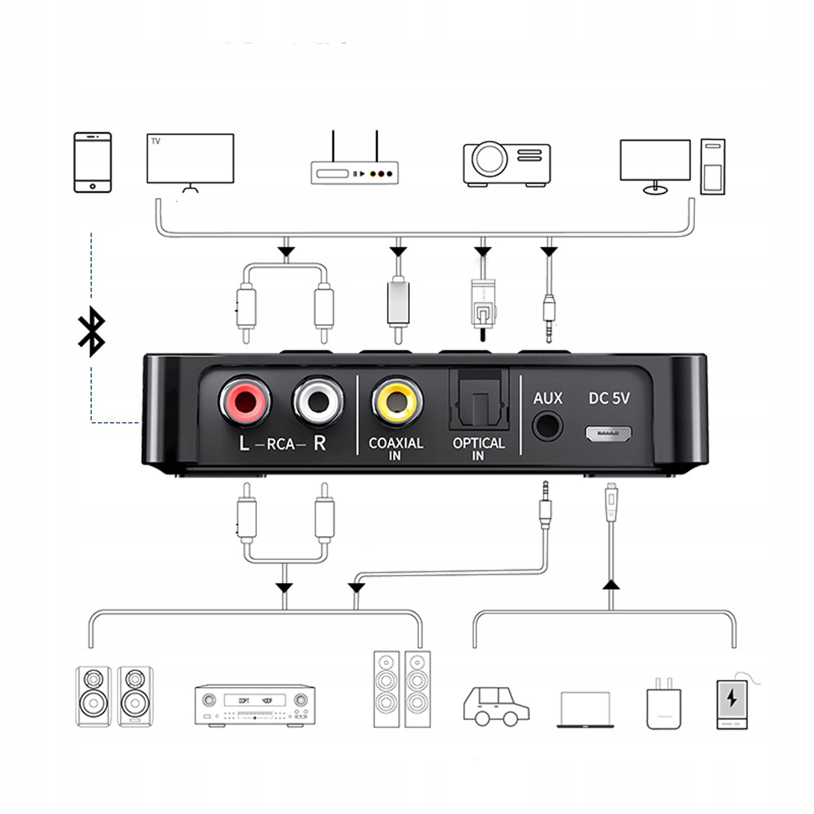 або аудіоплеєр автомобіля за допомогою кабелю AUX 3,5 мм, ToSlink або Aux/RCA.