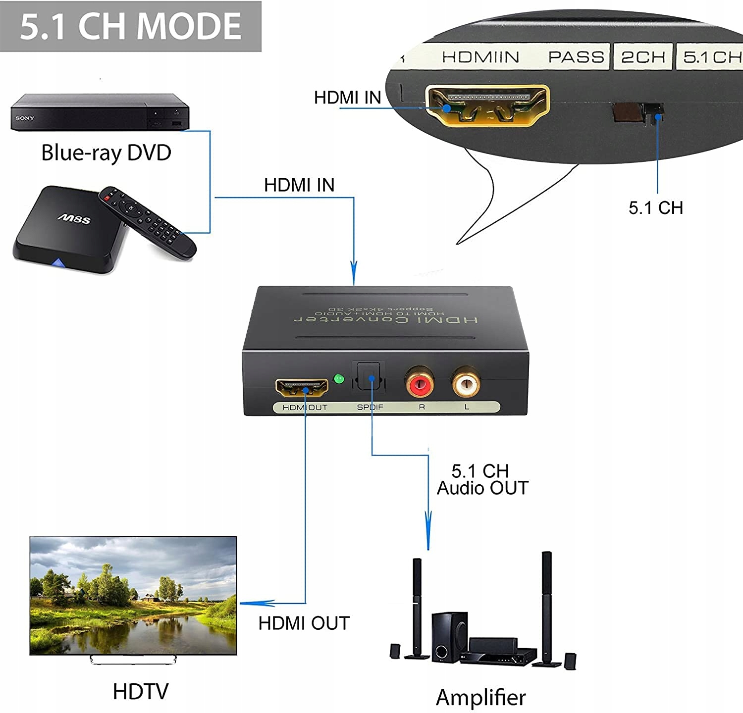 3 варіанти аудіорежимів: цей конвертер підтримує аудіорежими PASS, 2.0CH, 5.1CH. Є HDMI до HDMI; вибрати 2.0 CH можна виводити через RCA L/R; Select 5.1 CH може виводитися через оптичний Toslink. Дивіться на різних пристроях.