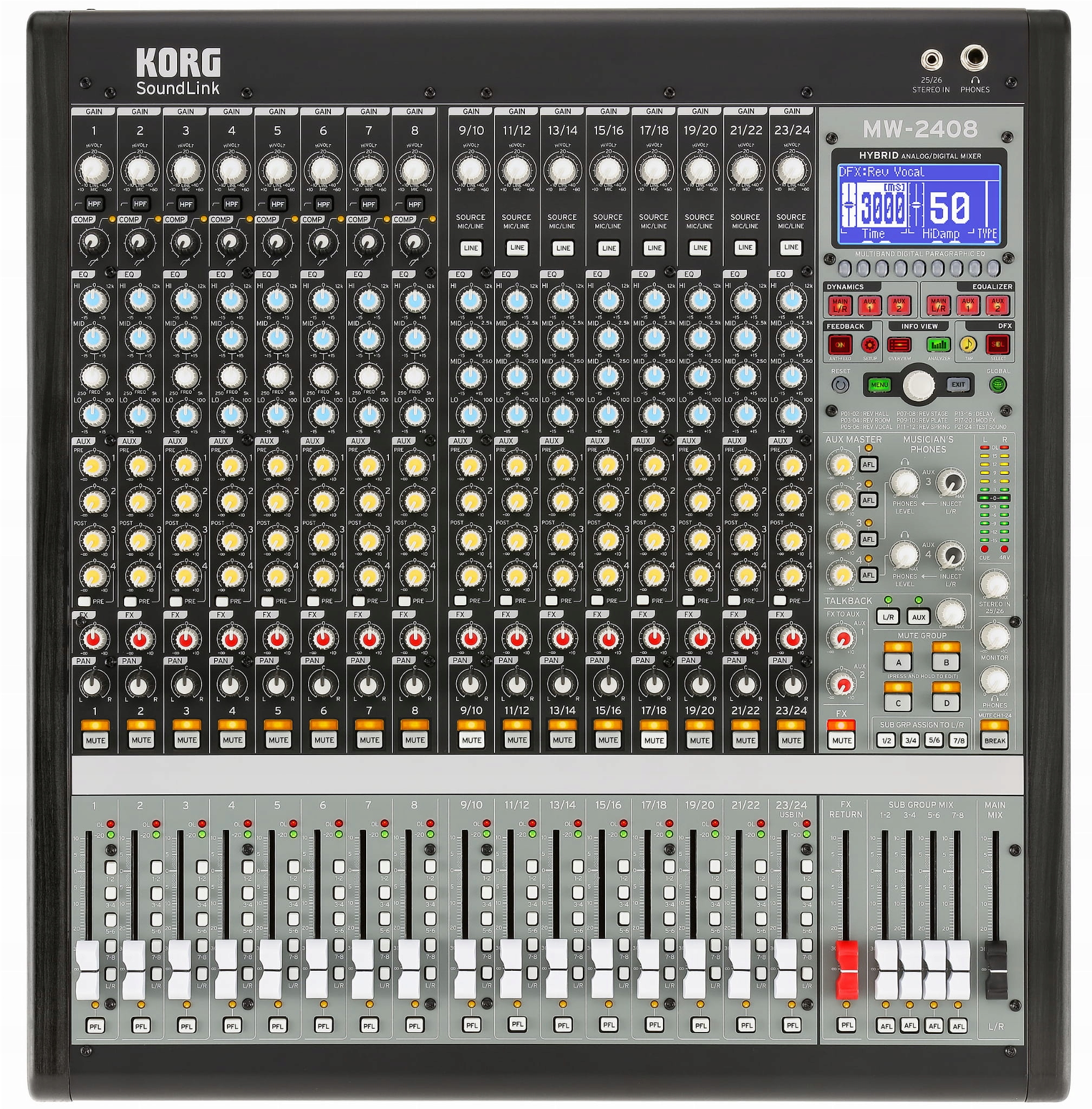 Високоякісні аудіомікшери KORG SoundLink із гібридним аналогово-цифровим дизайном. Розроблений, щоб зробити живе мікшування максимально простим. Моделі MW1608 і MW2408 оснащені стерео двостороннім аудіоінтерфейсом для підключення до комп'ютера, вбудованим 32-розрядним процесором ефектів Korg, поканальним керуванням компресором, інтелектуальним елімінатором зворотного зв'язку, 8 груповими виходами, 4 допоміжними посилами, більшою кількістю ефектів і опцій виходу. ніж будь-який міксер порівнянного розміру. Лінійні мікшери SoundLink також мають більший запас, ніж будь-який мікшер у своєму класі. Вони розроблені у співпраці з Грегом Макі та Пітером Уоттсом з наголосом на простоті використання, ергономіці та фантастичній якості.