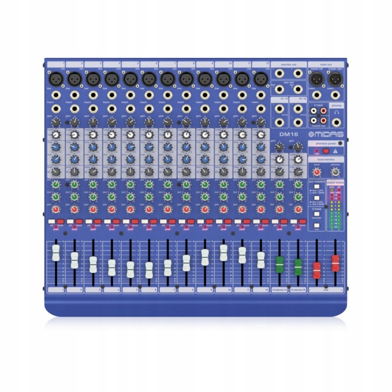 DM16 — це аналоговий мікшер для студійних і живих програм із 16 вхідними каналами та 12 мікрофонними попередніми підсилювачами Midas.