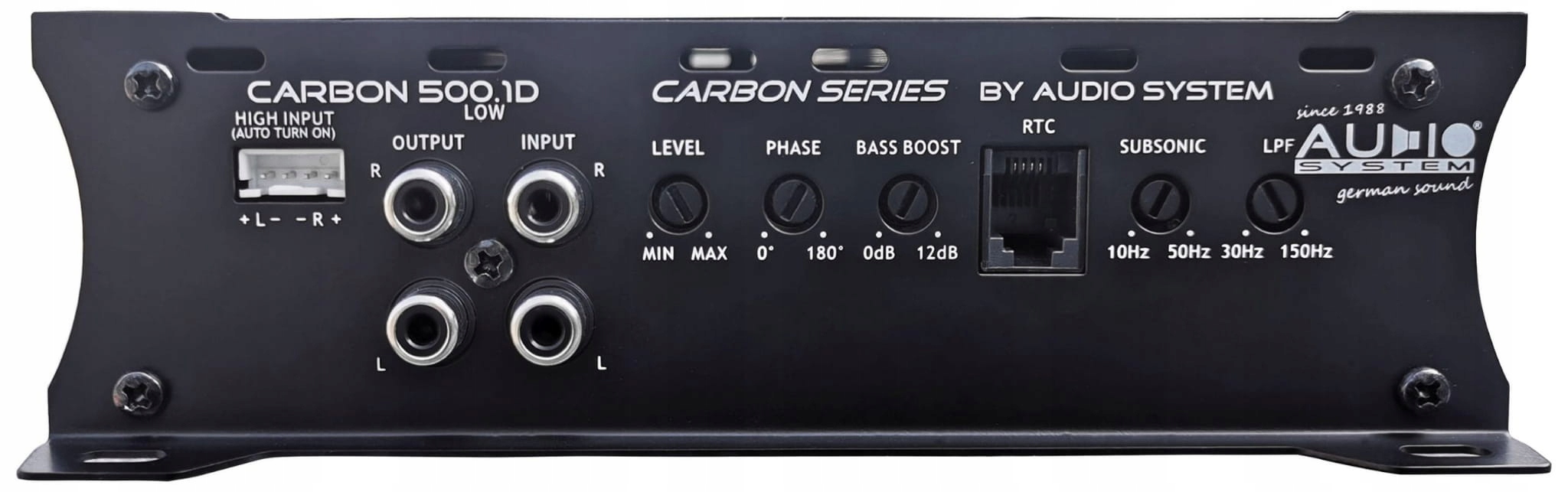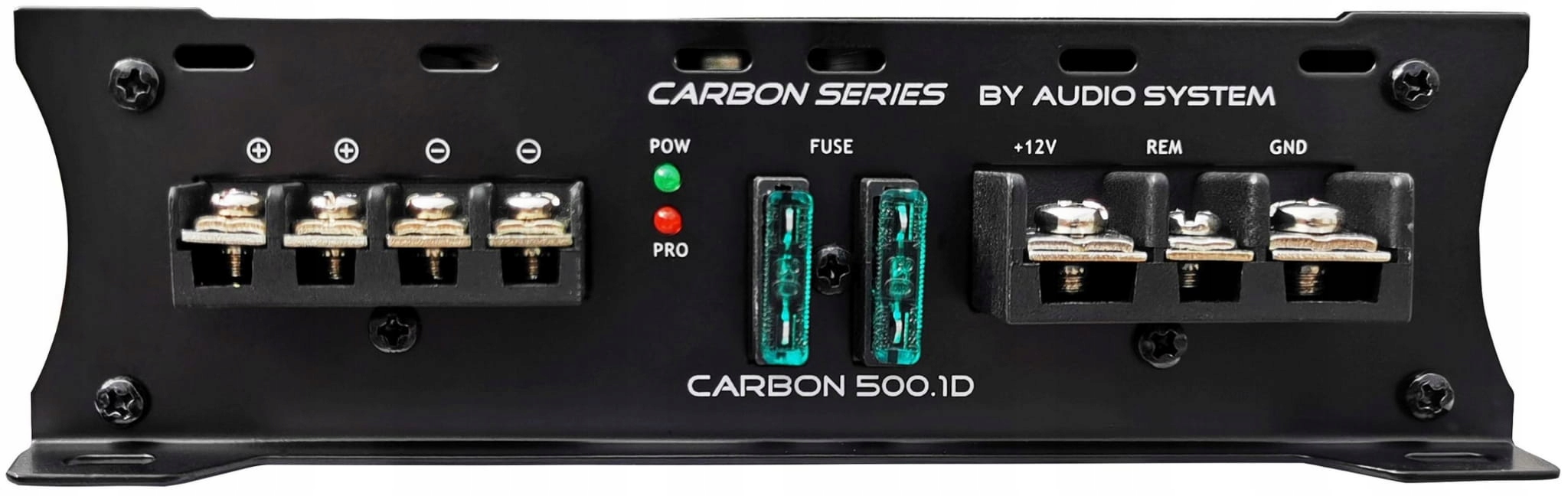 - Підсилювач: Цифровий моноблок аудіосистеми Carbon 500.1D потужністю 500/350 Вт RMS з вбудованим конвертером Hi-Low (можна підключити до заводської магнітоли !!!) li>