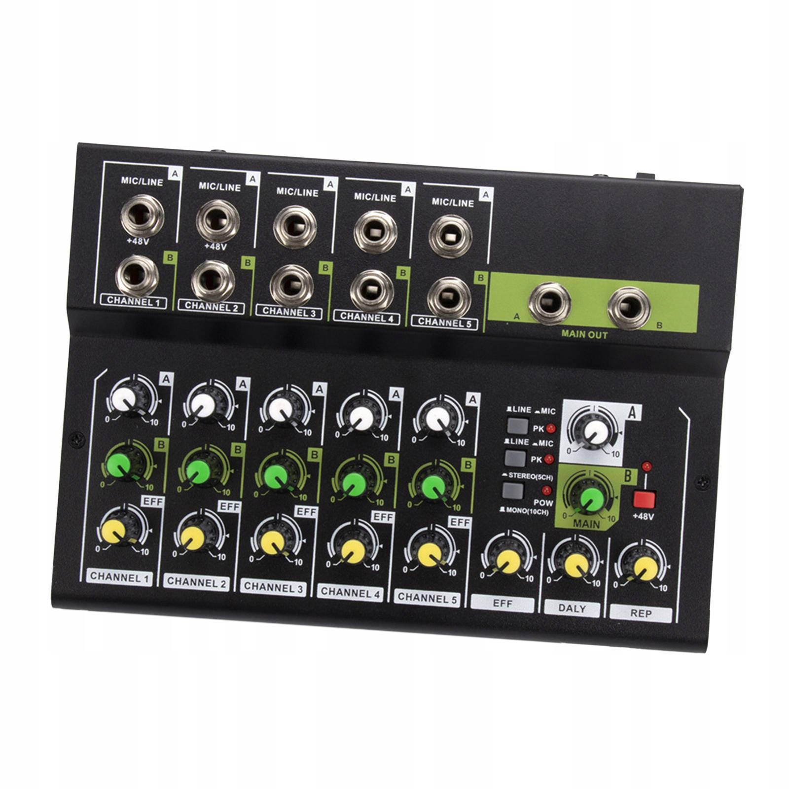 [Сумісність]: Змішувач аудіо може бути підключений до різноманітних аудіо обладнання. , Перемикач 48 В відповідає потребам динамічних мікрофонів конденсатора. Професійний процесор шуму може автоматично фільтрувати шум під час запису та грати плавно. > 4 Він має вхідні гнізди на 10 мікрофонів або ліній (RCA) для підключення мікрофонів, музичних інструментів або іншого аудіо обладнання, а також підтримує моно та стерео перемикання. 1-5 канал A, B вхідний об'єм може керувати єдиним об'ємом окремо.