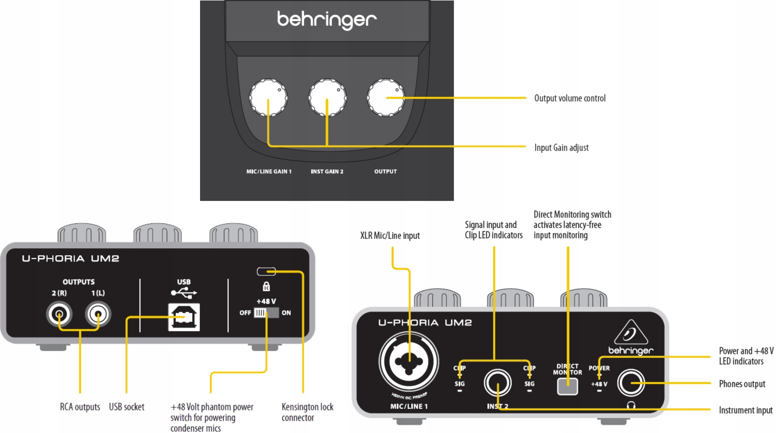 Моделі U-PHORIA оснащені малошумними попередніми підсилювачами Behringer XENYX (модель UM2) і чистотою звучання мікрофонних попередніх підсилювачів MIDAS у моделях UMC22, UMC202 і UMC204. Усі моделі мають професійне фантомне живлення 48 В для використання з конденсаторними мікрофонами.