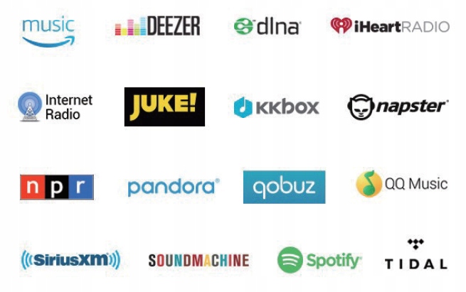 - Підтримка Amazon Music, Spotify, TIDAL, KKBox, SiriusXM, Napster, Internet Radio, Deezer, iHeartRadio, Pandora, SoundMachine , Qobuz, QQmusic