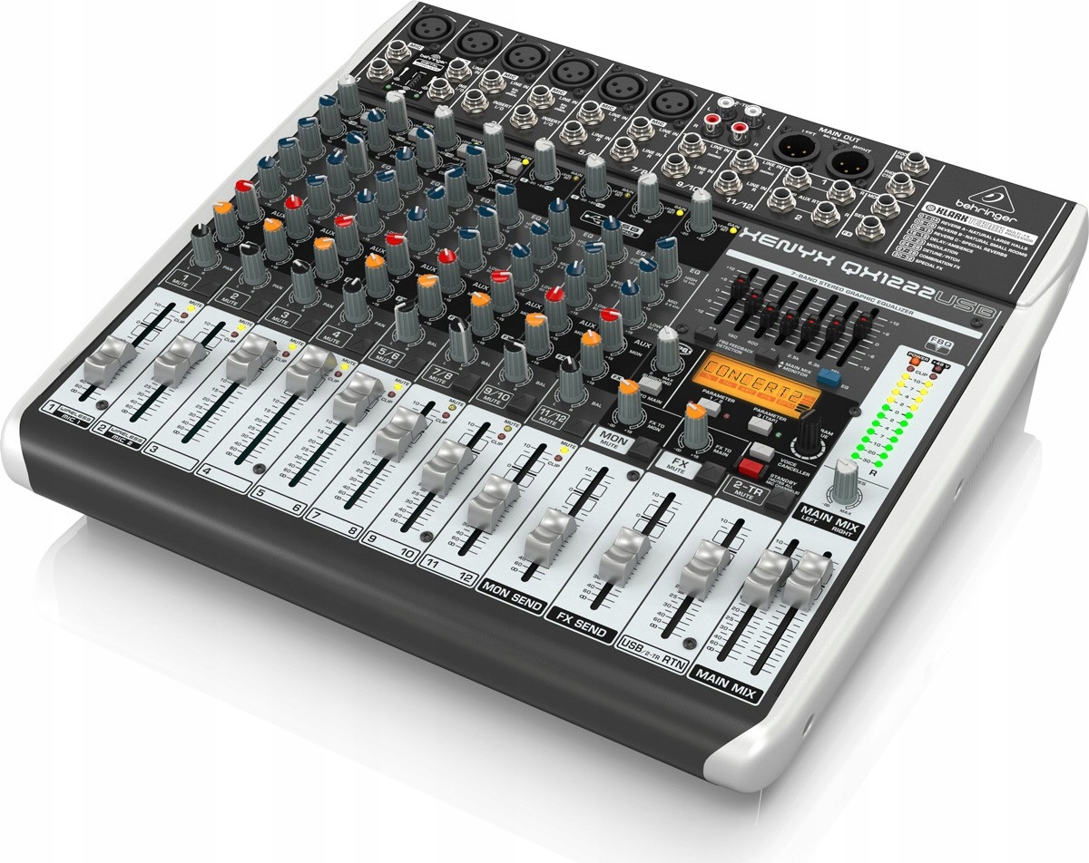 BEHRINGER XENYX QX1222USB - Аналоговий мікшер XENYX QX1222USB із ультранизьким рівнем шуму з процесором KLARK TEKNIK FX, 4 мікрофонними попередніми підсилювачами XENYX та індивідуальним фантомним живленням.